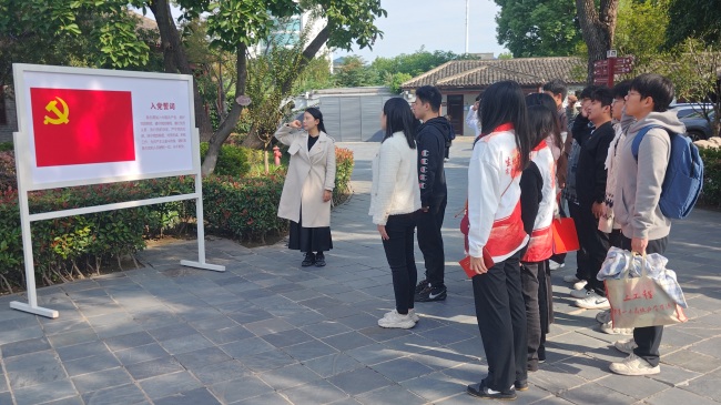 在中央农民运动讲习所的草坪前,第一学生党支部成员整齐列队,面向党旗庄严宣誓,铿锵誓言在红色地标上空回响,初心使命在师生心中激荡。