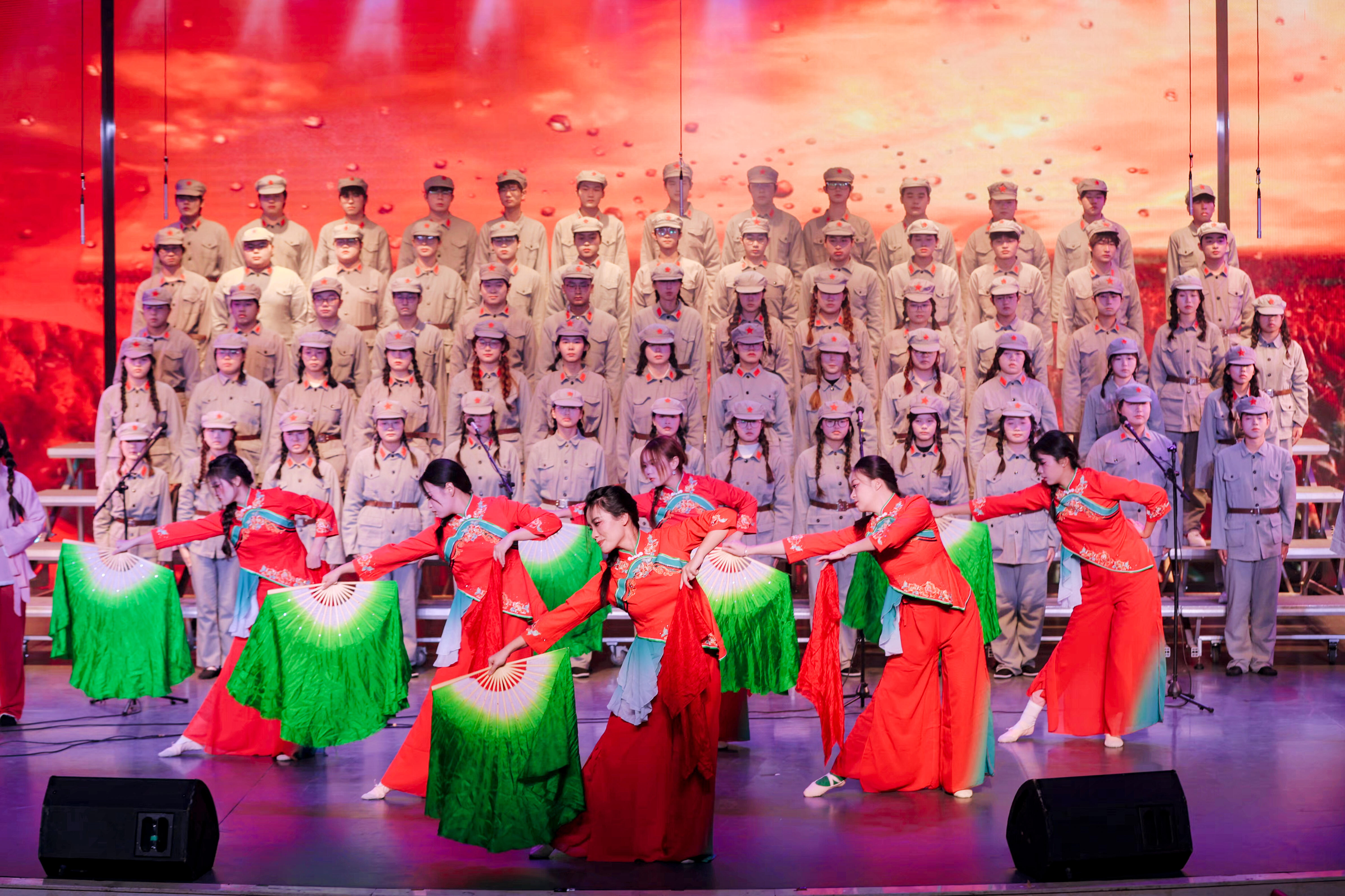 整场晚会以近代史脉络为轴,艺术化再现民族记忆。90分钟里,10首镌刻着时代印记的歌曲被重新“解码”——《松花江上》的悲怆呼号,把1931年的山河之殇拉回眼前;《太行山上》的铿锵鼓点,再现“母亲叫儿打东洋”的军民深情;《保卫黄河》多声部层层递进,如惊涛拍岸;穿插其间的舞蹈《九儿》,更以细腻的个体叙事,折射出大时代中个人与家国命运的交织。当如泣如诉的唢呐声划破寂静,瞬间将观众的思绪拉入那片广袤的高粱地。值得一提的是,这首高难度独奏的演绎者,竟是该校一位平日耕耘在学生工作一线的辅导员老师。他从讲台走向舞台,用这件极具感染力的民族乐器,将作品中那份悲壮与不屈诠释得淋漓尽致。
