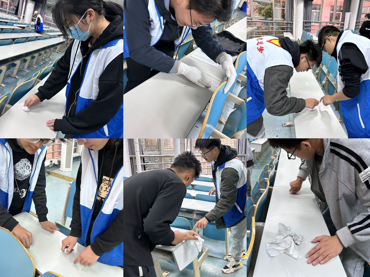 在此次活动中,电气系志愿者们分工明确,各尽其责。活动过程中,志愿者八人一组分小队进入指定教室对课桌进行清洁。他们拿着橡皮擦,湿巾等工具一丝不苟地清理着桌面,以认真的态度,高质量地完成任务。教室虽多,但是电气系志愿者们充分发扬不怕脏,不怕累,不怕麻烦的优良作风,齐心协力把教室桌面涂鸦清理干净。