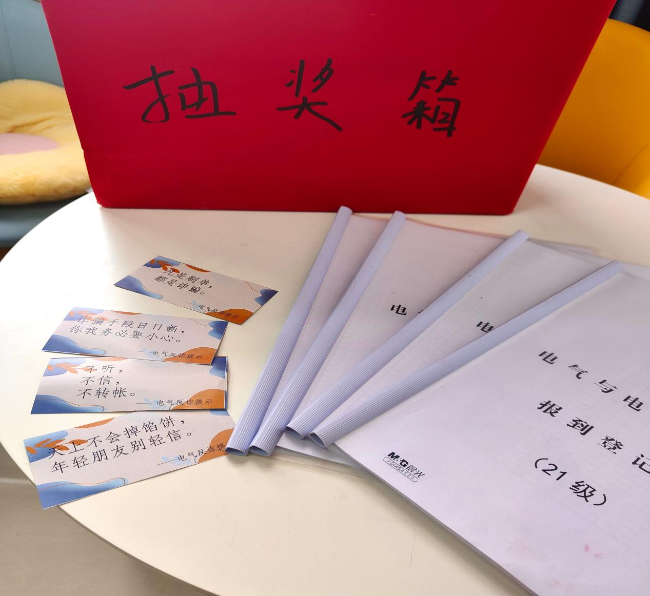 “老师们提前一周就开始筹备了,防诈骗提示语和红包礼物都是老师们精心准备的,一份‘盲盒’礼品算不上贵重,但是承载着新学期的希望。希望用这些暖心的方式,消除同学们开学的焦虑和长假的倦怠,让同学们感觉到老师的用心和集体的温暖。”电气与电子工程系党总支书记庞雯介绍说。