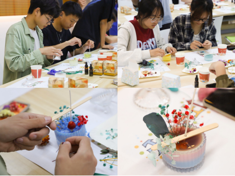 在动手实践环节,同学们挑选喜爱的模具、颜料、香料及干花,按照熔蜡、倒蜡、静置、放花材、冷却、脱模、挂绳的顺序耐心制作。制作结束后,大家纷纷展示了自己的作品,并踊跃分享自己的用料及设计理念,大家彼此分享交流,每个人都沉浸在创造的喜悦中。“大家各自发挥想象力和创造力,创造独一无二的艺术品,亲自制作的香薰正好作为母亲节礼物,这次活动也让我们收获快乐、增进友谊、提升审美,”23gb通信2班童瑜帆同学感慨。