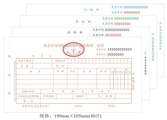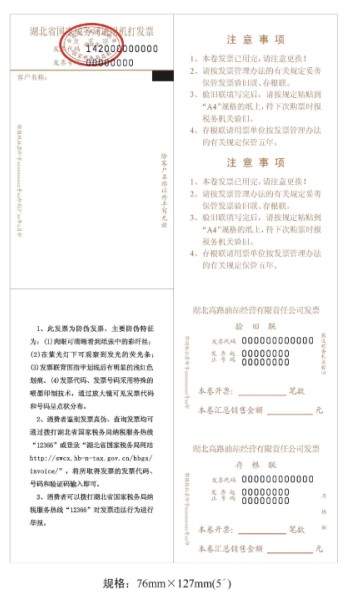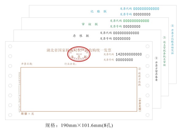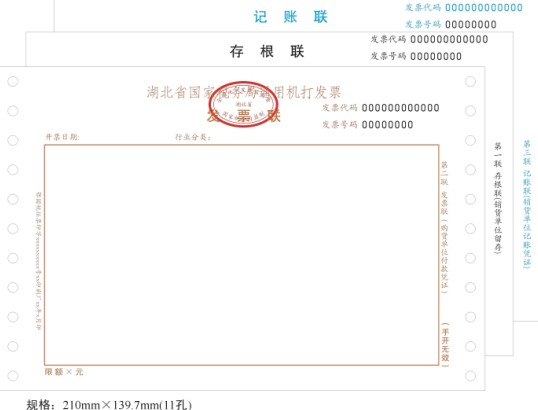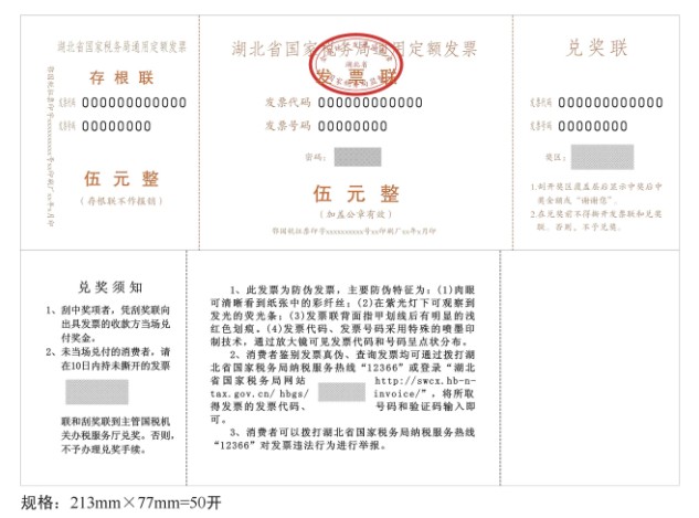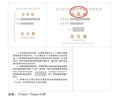 普通发票简并换版后主要启用湖北省国家税务局通用机打发票、湖北省国家税务局通用手工发票、湖北省国家税务局通用定额发票三大类。其中:通用机打发票分平推式和卷式两种,平推式机打发票的规格为190mm×101.6mm、210 mm×139.7mm(税务机关代开发票专用),卷式机打发票设置宽度为76mm。通用手工发票分百元版和千元版两种,规格为190 mm×105mm。通用定额发票划分为伍元、拾元、贰拾元、伍拾元、壹佰元共5种面额,规格为175 mm×70mm。