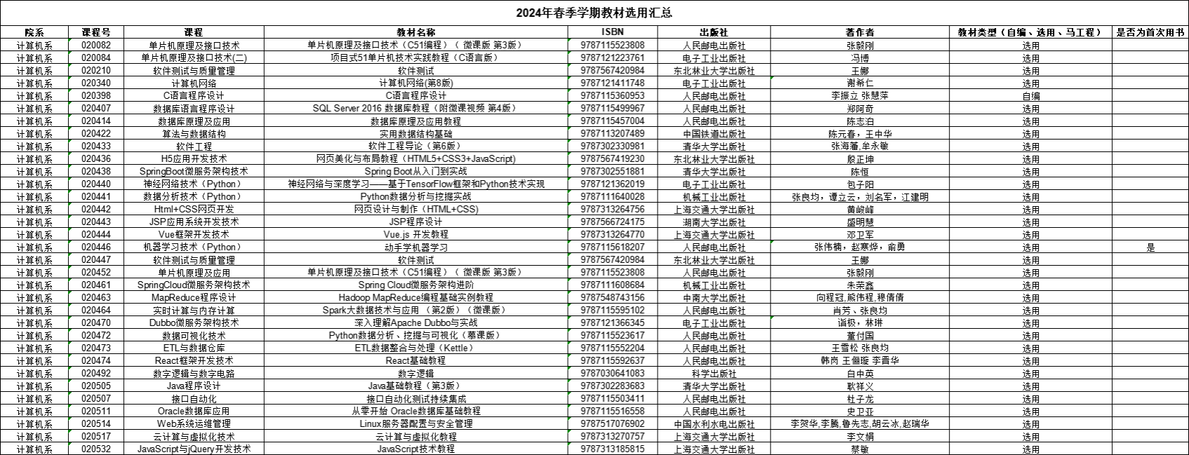 经任课教师申请、我系教材管理工作组审议,现将《计算机系2024年春季学期教材选用汇总表》予以公示。