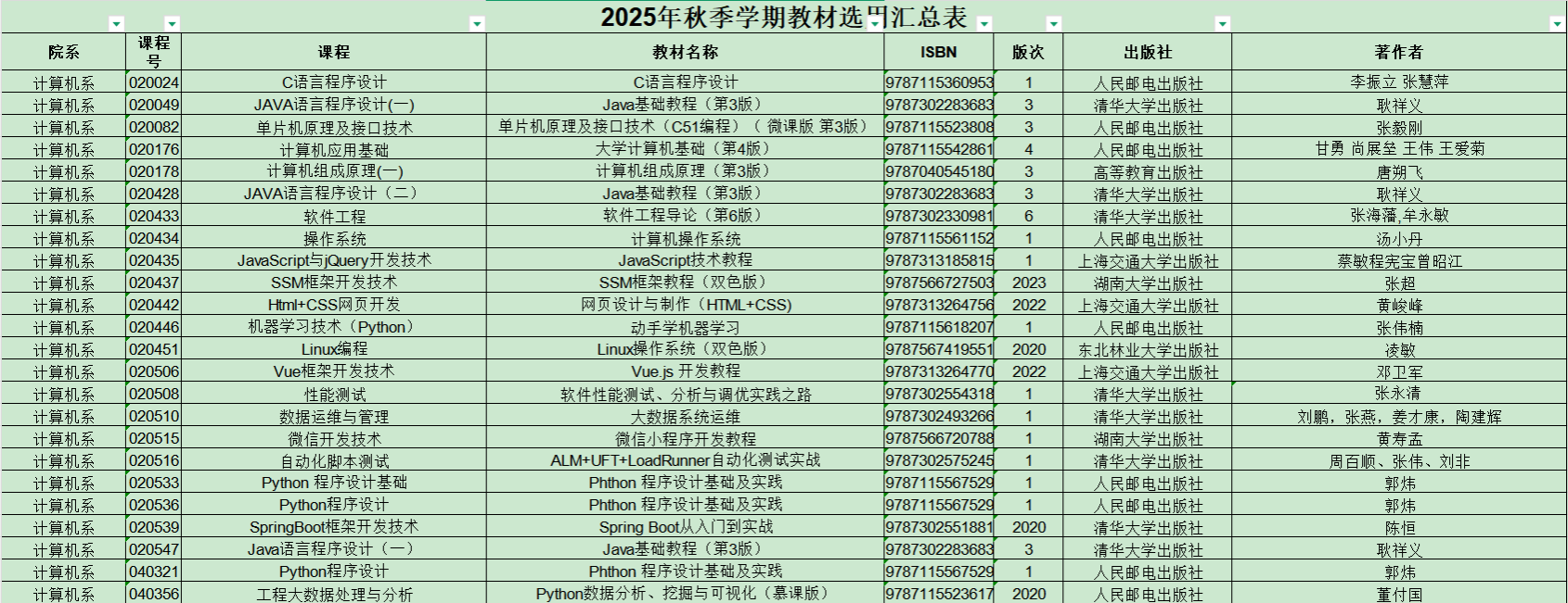 经任课教师申请、计算机系教材管理工作组审议,现将《计算机系2025年秋季学期教材选用汇总表》予以公示。
