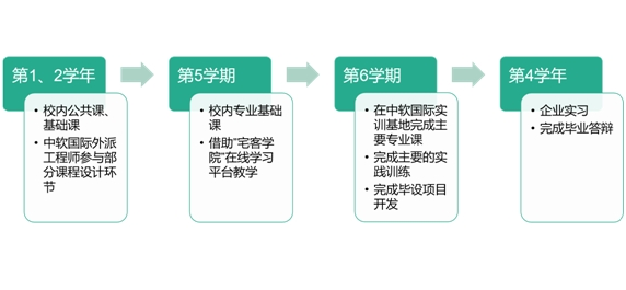 【教学体系】中软国际特有的2.5+0.5+1的教学体系,在前2.5学年中以学校的课程为主(通识课+学科基础课),中软国际的课程为辅(学科核心课),重点在0.5学年的教学模式上,以周课时40节+晚自习的模式,用20周的强化实训培养出符合社会需要的IT应用性人才。