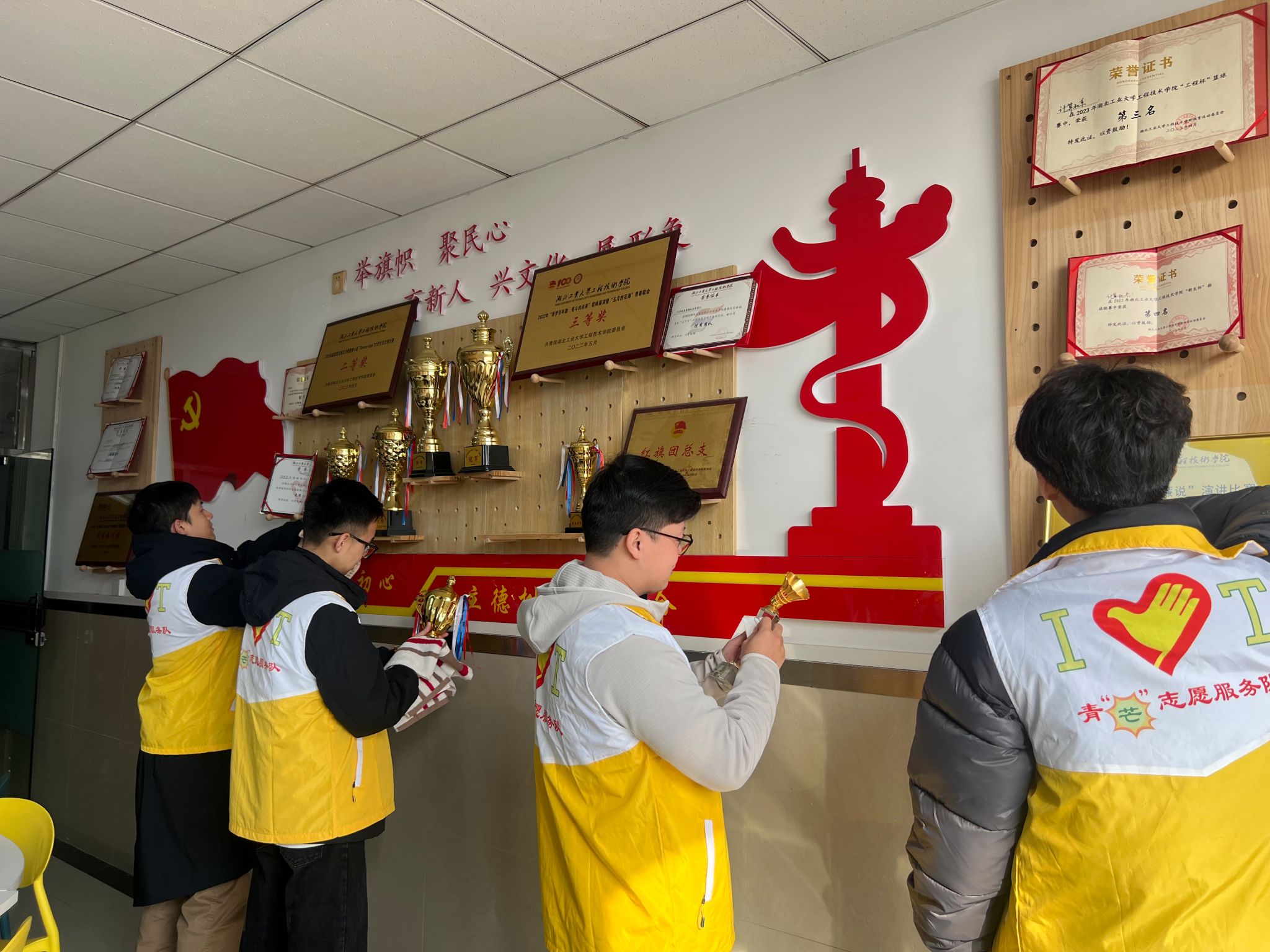 意气昂扬,扬帆远航,计算机系IT青芒志愿服务队是团学内的志愿服务组织,也是协助开展各项校友工作,为校友提供相关服务的志愿服务团体,本次校友活动中,来访校友们反转角色,做起了系里的志愿者,既是对学弟学妹们志愿服务的回应,也是践行志愿服务的精神传承。校友唐恬一边带大家清理活动室,一边向同学们传授经验,她表示由于在校园中参加过众多的志愿服务活动,久而久之也让自己形成了定期参与志愿服务活动的习惯,因此在毕业后她也要求自己一定时间内必须参与一定量的志愿服务活动,并且会在每一次的志愿服务活动中记录下自己在此次志愿服务活动中的收获。志愿服务队队长蒋洁对此颇有感悟,校友党员的实践课堂以其亲身经历向在校学生干部党员同学们作出榜样,更是促进大家在实践中更深一步地增强社会责任感和奉献精神。
