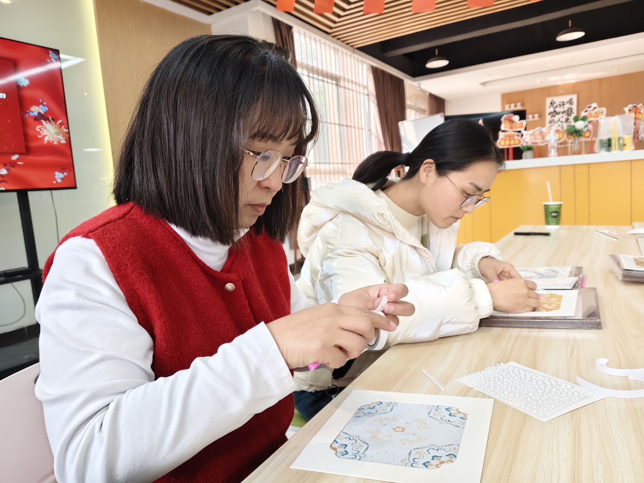 通过视频展示与实物讲解,教职工们深入了解了宋锦的文化历史,其独特的起源、发展历程以及在不同时期的特色。在实践环节中,老师们纷纷发挥创意,将珍珠镶嵌于锦面之上,制作出一幅幅兼具传统韵味与现代美感的手工作品。大家在制作的过程中,不仅感受到了传统手工艺的魅力,对传统文化有了更深的认识,还增进了彼此间的交流互动。