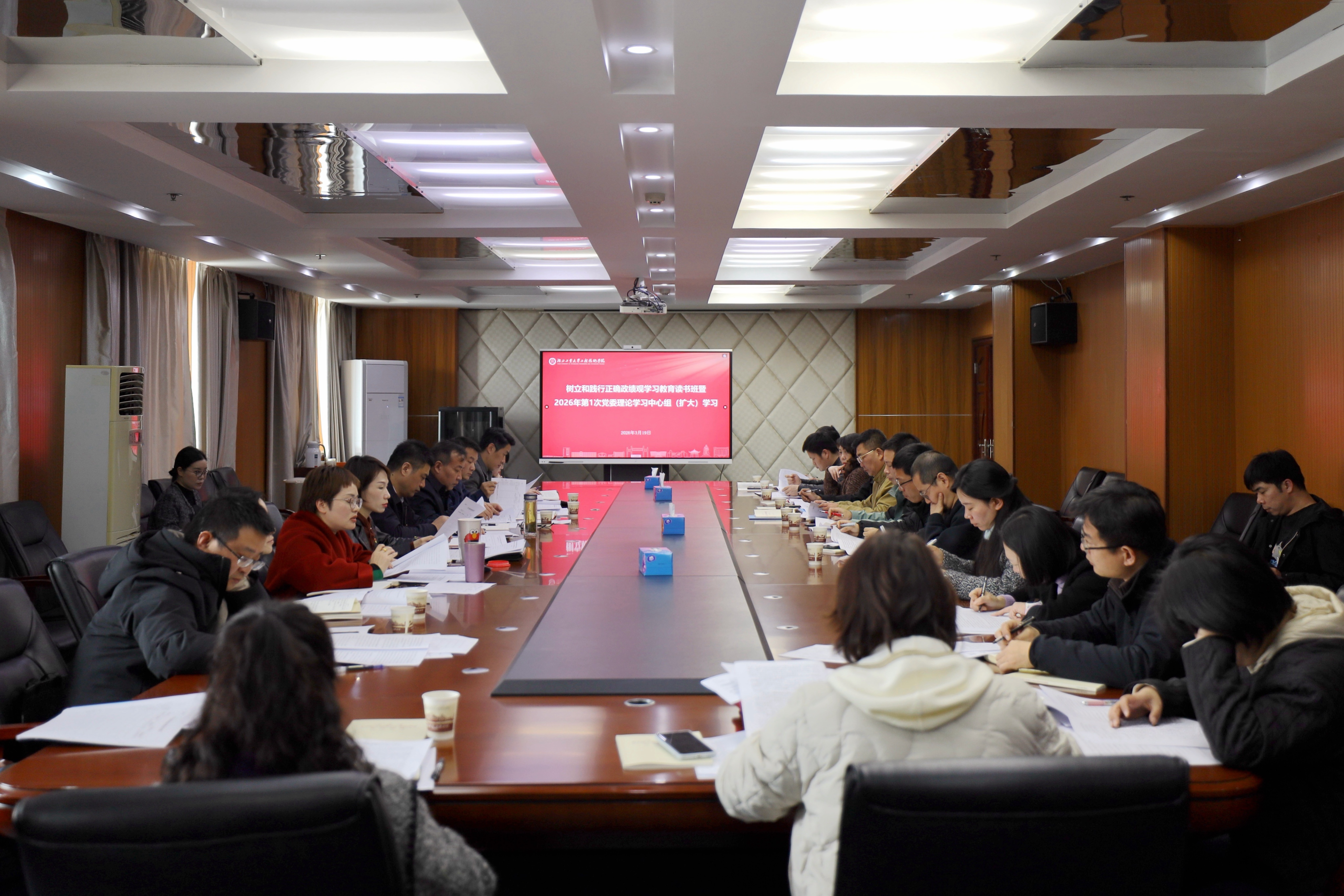 3月19日,学院举行树立和践行正确政绩观学习教育读书班暨2026年第1次学院党委理论学习中心组(扩大)学习,深入学习贯彻习近平总书记关于树立和践行正确政绩观的重要论述,开展“聚力‘十五五’,实干谱新篇”思想大讨论。学院领导、学院党委理论学习中心组成员、各职能部门负责人、各党总支书记参加学习。