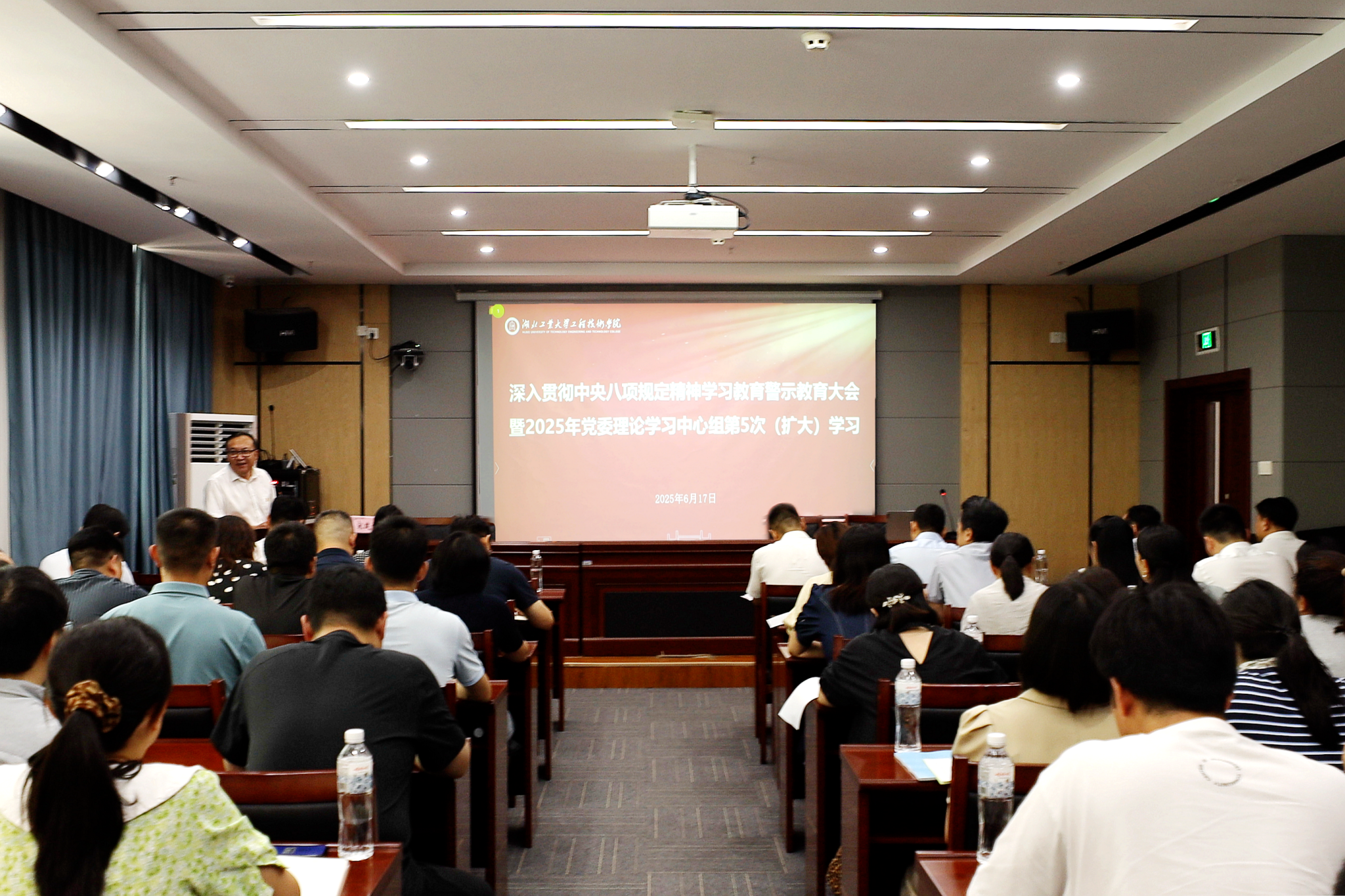 6月17日下午,学院举行深入贯彻中央八项规定精神学习教育警示教育大会暨学院党委理论学习中心组第5次(扩大)学习,邀请湖北工业大学纪委监察专员办公室 案件审理室主任鉴定作专题辅导报告。会议由学院纪委书记宋建林主持,学院领导、全体中层干部及重要领域管理人员参加学习。