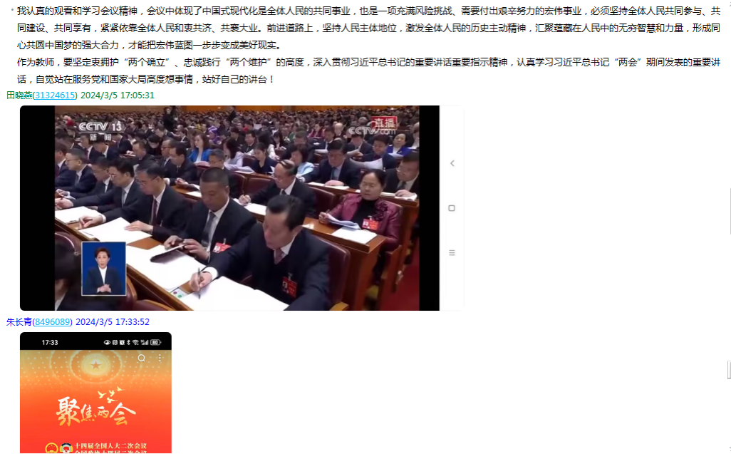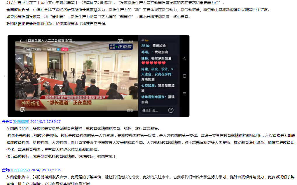 两会期间,收看了李强总理的政府工作报告,报告全面回顾了2023年中国社会经济取得的成就,谋划了2024年主要预期目标,部署了今年的部分重点工作和十大任务,报告务实丰富,催人奋进,如深入实施科教兴国战略,强化高质量发展的基础支撑;坚持不懈抓好“三农”工作,扎实推进乡村全面振兴;推动城乡融合和区域协调发展,大力优化经济布局;加强生态文明建设,推进绿色低碳发展;切实保障和改善民生,加强和创新社会治理。将认真学习研究,落实到日常教学研究和实践当中,站在新的历史起点上,将以强烈的使命感和责任感勇于担当作为,充分发挥教师立德树人,为国育才的使命。