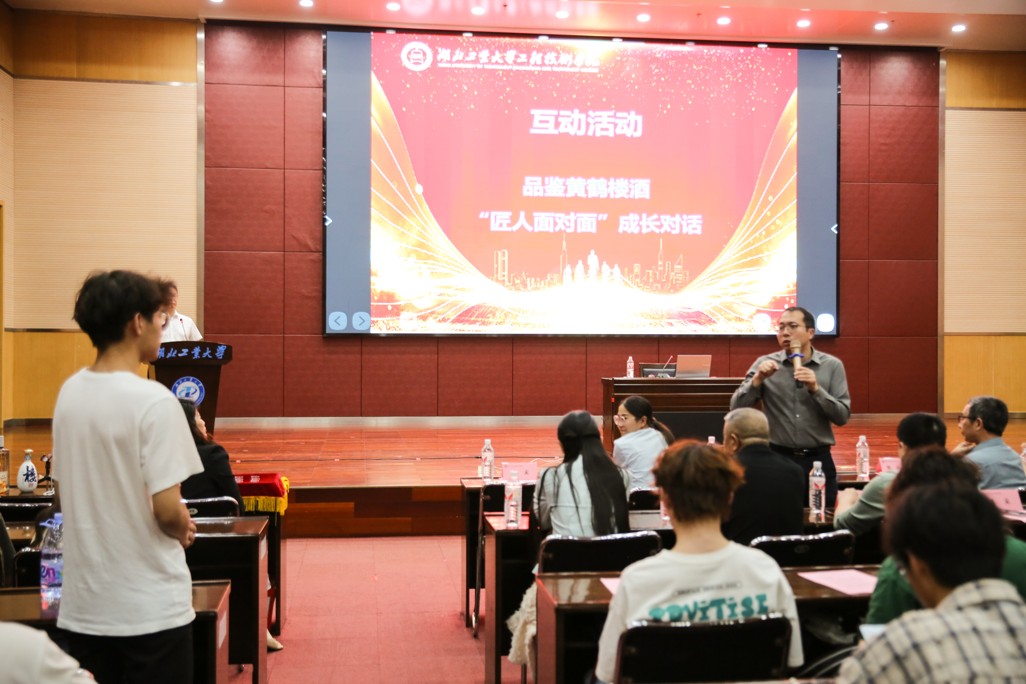 现场还开展了沉浸式的黄鹤楼酒品鉴活动,浓烈的酒香飘遍会场的每一个角落,全场领导嘉宾和师生们共同享受了一场嗅觉盛宴,领略了南派大清香的文化底蕴和中国酒文化的博大精深。随后的“匠人面对面” 成长对话环节,同学们积极向两位校友咨询职业规划、技能提升等问题,两位校友耐心解答,现场气氛活跃,同学们意犹未尽。