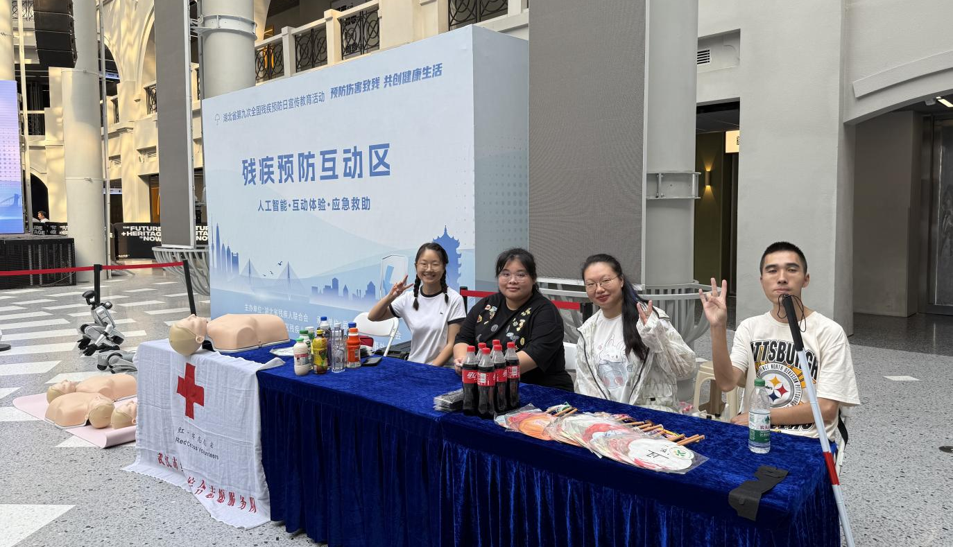 湖北工业大学工程技术学院金星志愿服务队受邀参与此次活动,于残疾预防互动区精心设计并开展“触觉探索:请帮我拿瓶水” 与 “听觉导航:无声引路” 两大盲人体验游戏,以沉浸式互动形式向民众传递残疾预防理念,收获现场市民广泛好评。