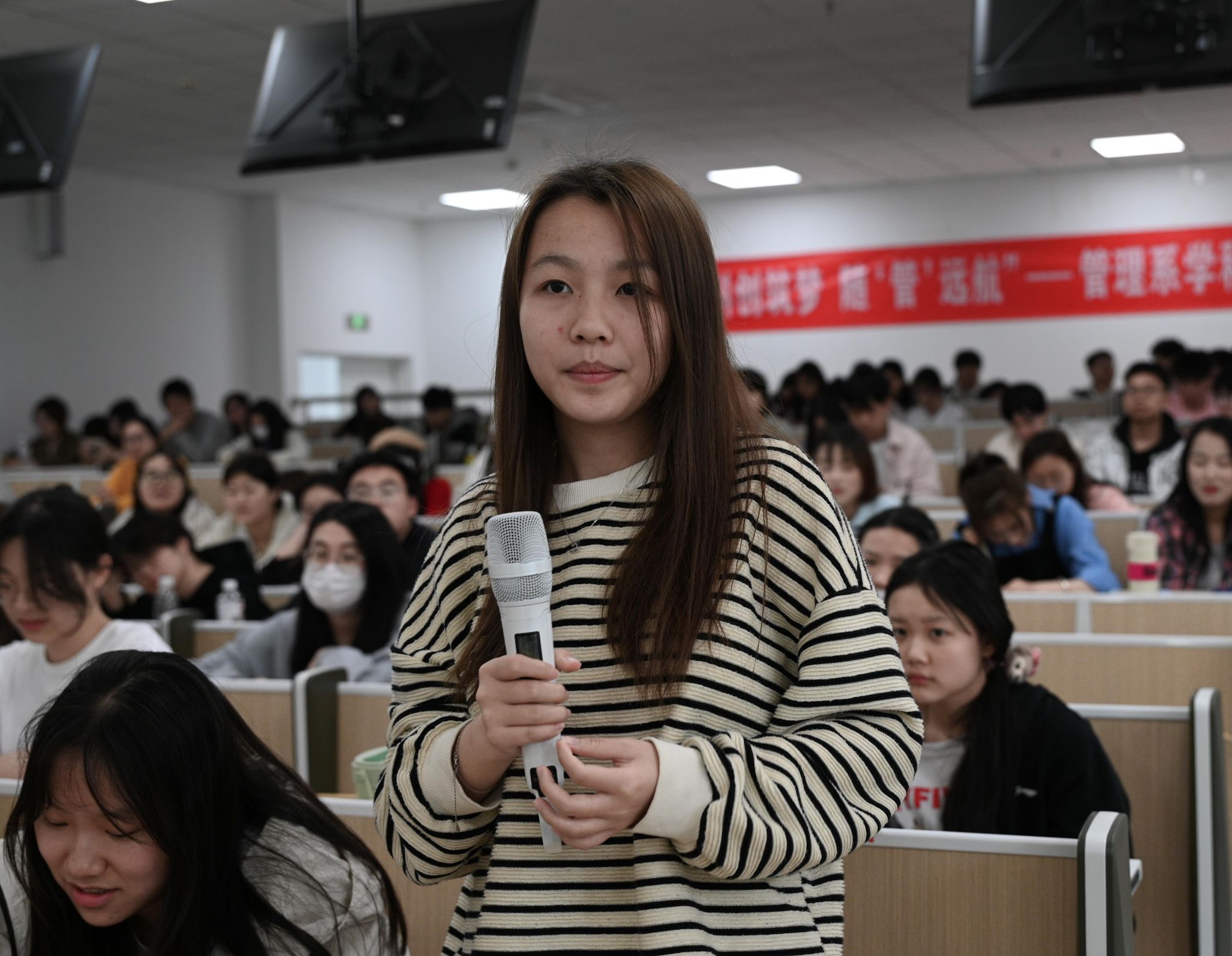 最后的问答环节,由管理系学生会执行主席施敏航同学结合自己丰富的参赛经验和优异的竞赛成绩为大家答疑解惑。他建议同学们积极参加各类竞赛,通过竞赛可以更深入地理解和掌握学科知识,提高学习成绩,提升解决问题的能力、团队协作能力以及创新思维,积累丰富的实践经验,增加未来求职或升学的竞争力。