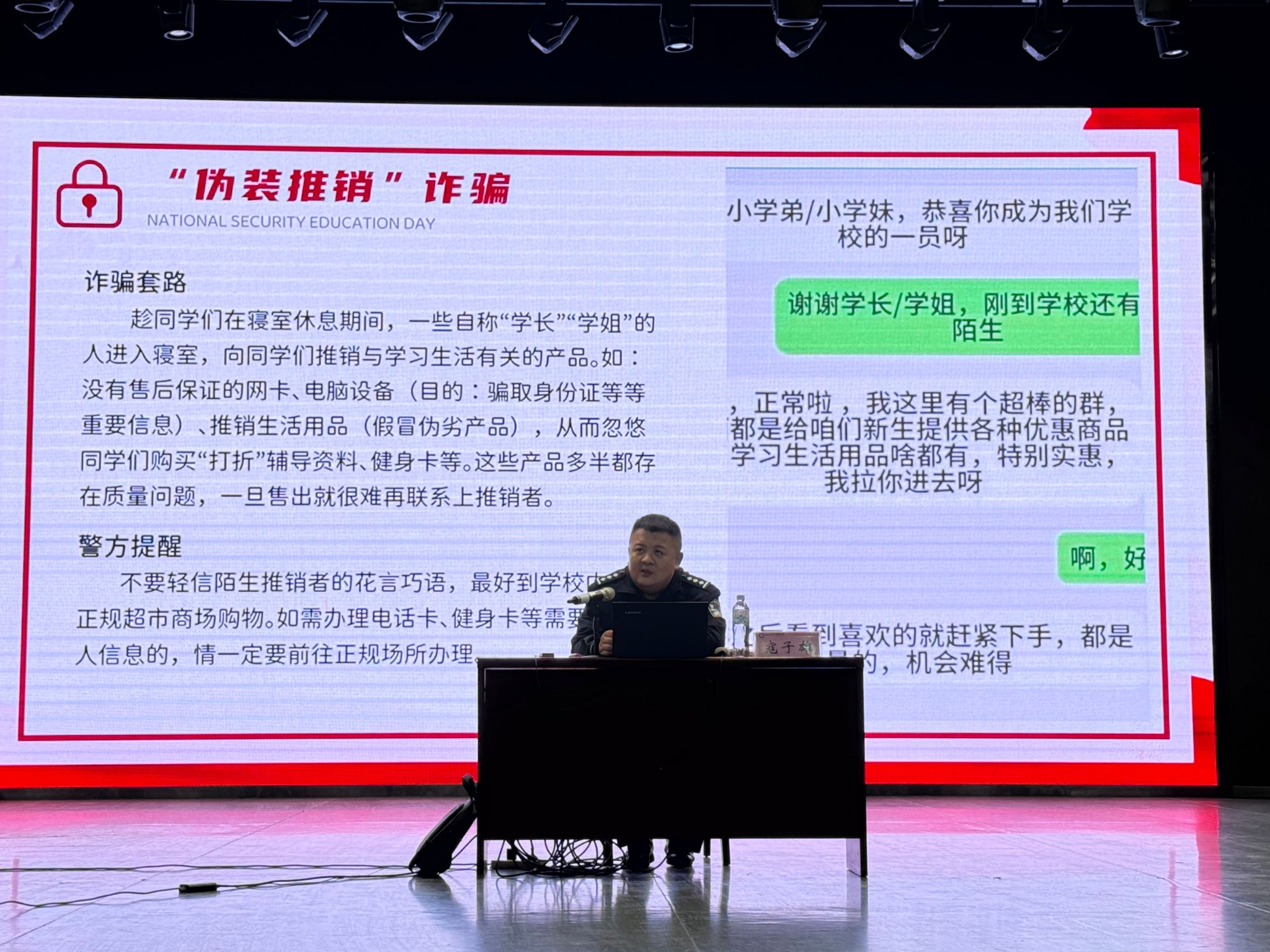 课程聚焦《中华人民共和国国家安全法》《中华人民共和国网络安全法》《中华人民共和国反恐怖主义法》,通过“电信诈骗类型解析”“反恐实战经验分享”“网络越境行为警示”三大模块,将抽象法条转化为具象场景。授课过程中,寇警官以“发现可疑人员偷拍军事设施如何应对”“遭遇网络诈骗如何紧急处置”等实际问题为切入点,通过分组讨论、角色扮演等互动形式,激发学生思辨能力,现场气氛热烈。