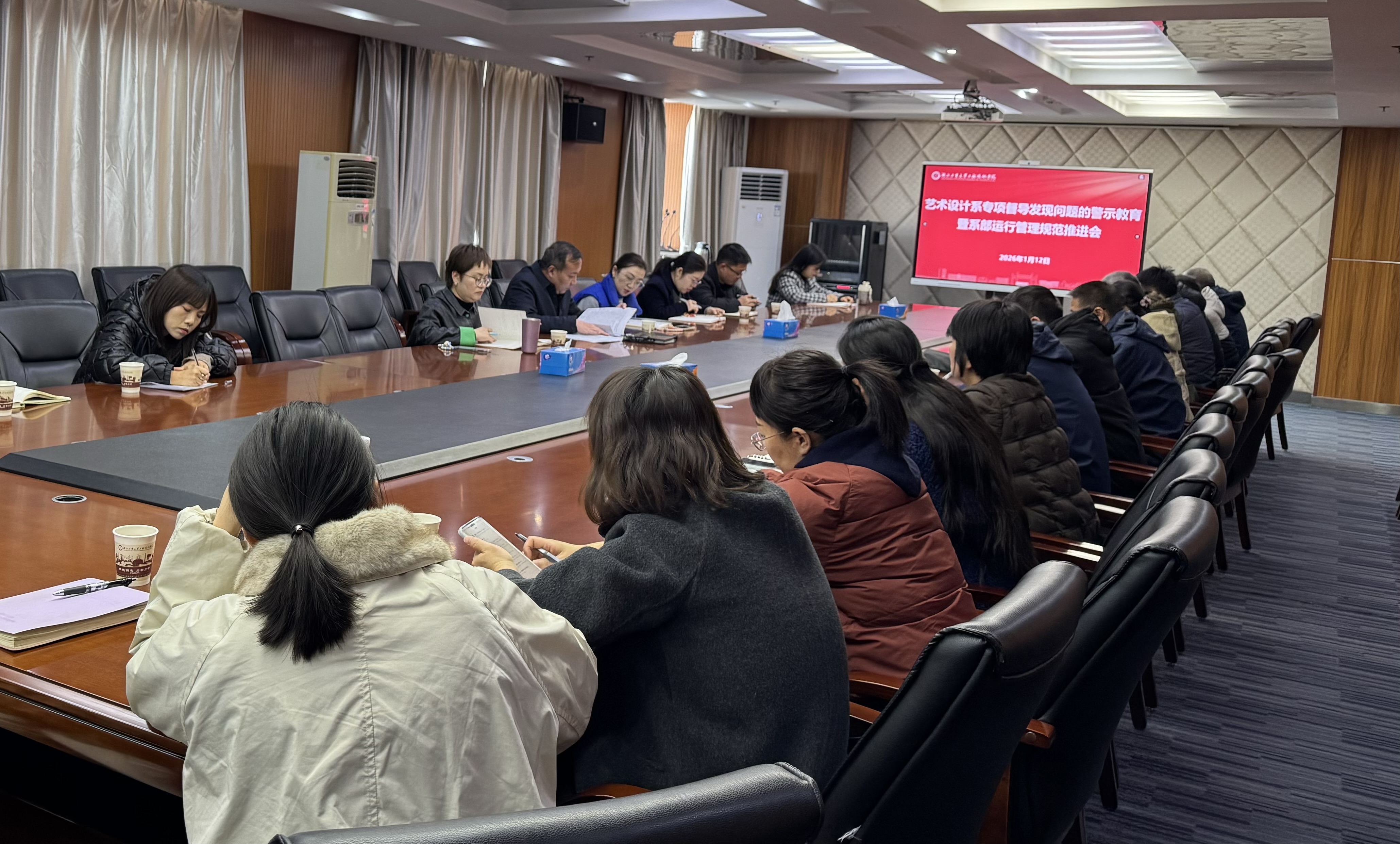 为深化全面从严治党向基层延伸,强化“以身边事教育身边人”的警示教育实效,督促提升系部基层治理能力,1月12日下午,学院召开艺术设计系专项督导发现问题的警示教育暨系部运行管理规范推进会。纪委书记宋建林出席会议并讲话,“一院九系两部”党政主要负责人及专项教育督导组成员参加会议。会议由纪检监察办公室主任阮芳主持。