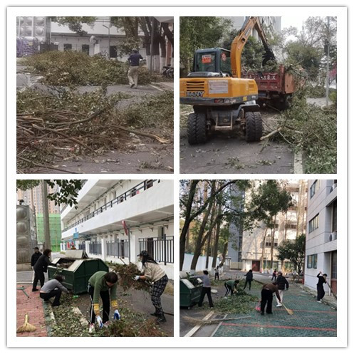 由于工作量较大,学院提前安排大型清运设备进场。一大早,抓车、转运货车就展开了清运工作,校园里人力和机械一起上阵,沿着教学楼和宿舍楼主干道,对道路上的树木、树枝进行清理、拖运,消除安全隐患。