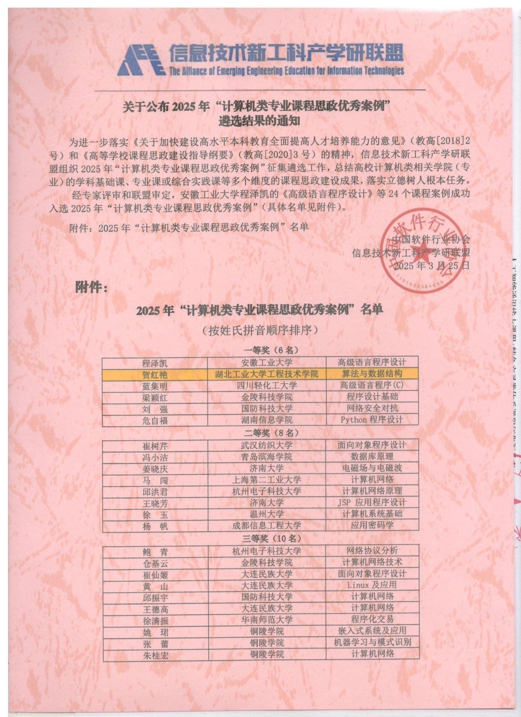本次大会以“落实产出导向,深化课程思政,落实计算机类人才培养立德树人”为主题,邀请了国家万人计划教学名师蒋宗礼教授、湖北省教学名师秦磊华教授、浙江省万人计划教学名师施晓秋教授出席会议并做了主题报告。大会组织专家对来自全国各个高校择优推荐出来的课程思政优秀案例进行了严格的评审,最终发布了2025年“计算机类专业课程思政优秀案例”一等奖6名,二等奖8名,三等奖10名。我校贺红艳副教授牵头的《算法与数据结构》课程,荣获了计算机类专业课程思政优秀案例一等奖。