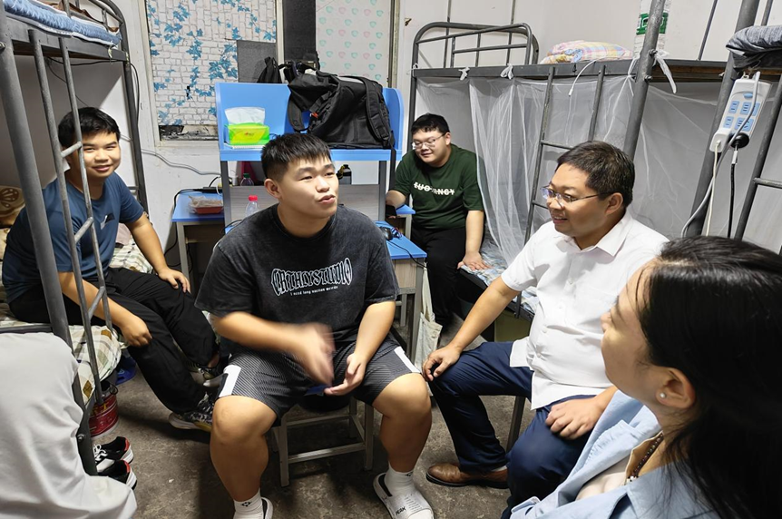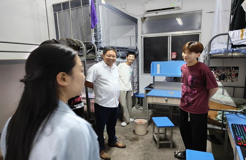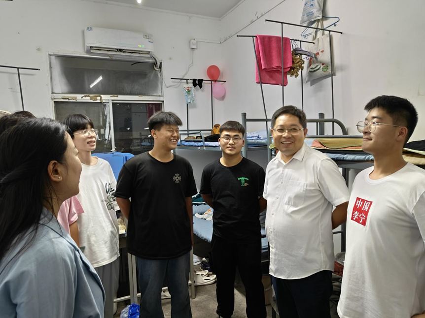 在这个温馨的夜晚,黄华副院长一行人逐一查看了每个新生宿舍。详细询问了同学们的住宿和生活状况,关切问候同学们的兴趣爱好和食宿习惯,倾听他们的心声,对学生提出的问题给予了及时答复。