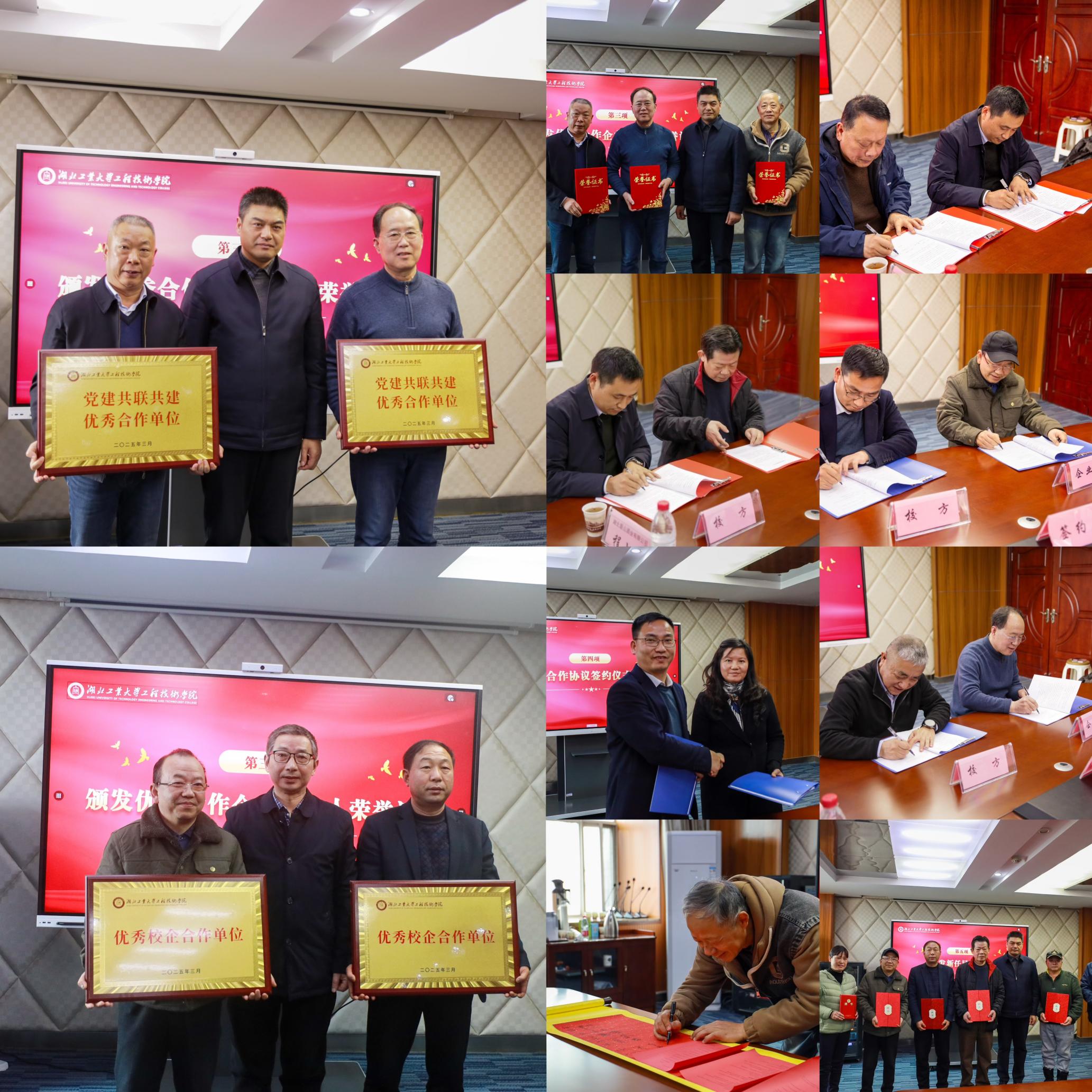 会上,学院党委书记朱爱军、院长张业鹏分别为武汉食品工业协会、黄鹤楼酒业有限公司颁发了党建共联共建优秀合作单位奖牌,为湖北聂山酒业有限公司、湖北清鲟生物科技有限公司颁发优秀校企合作单位奖牌,为多位聘任学院兼职思政导师、就业导师做出突出贡献的企业家颁发荣誉证书。随后与多家企业签署党建共联共建、实习基地协议、产学研合作协议等,并发起校企合作倡议,邀请全体与会企业集体签署《产学研战略合作倡议书》。