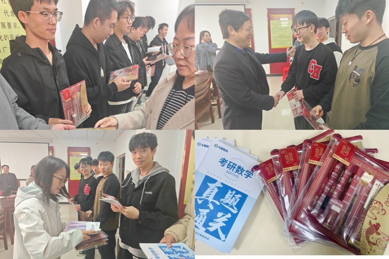 活动最后,领导老师们为每位考研同学发放了精心准备的暖心考研加油包,印有“逢考必过”祝福语的加油包中装满了饱含祝福的慰问品——一套考研真题通关资料、一套考试文具用品、一副蒸汽眼罩,预祝考研学子成功上岸、金榜题名。