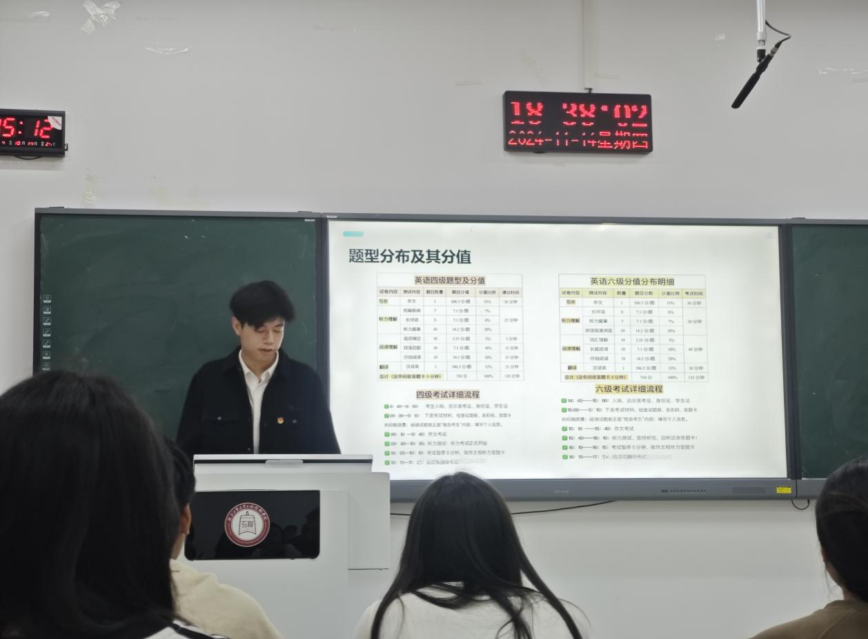随后,我系优秀学生代表从个人的学习经历出发,以真挚的情感和详实的案例,向在座的同学们分享了他在学习道路上所经历的挑战与收获。他不仅详细阐述了四六级英语考试的备考策略,包括如何高效复习词汇、掌握语法要点、提升听力与阅读理解能力等,还着重指出了考试中的难点与易错点,为同学们提供了宝贵的备考建议。