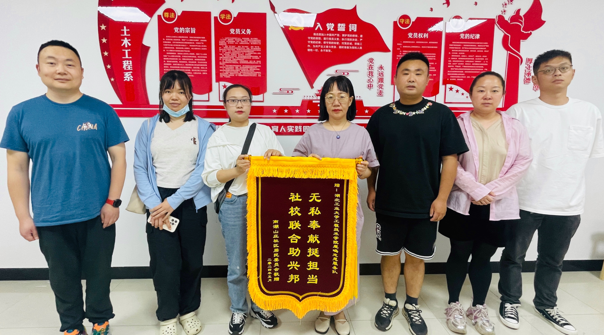5月27日下午,武汉市洪山区南湖山庄社区工作人员一行在土木工程系“沐晨”党员活动室为鹿鸣志愿队赠送写着“无私奉献挺担当,社校联合助兴邦”的锦旗。