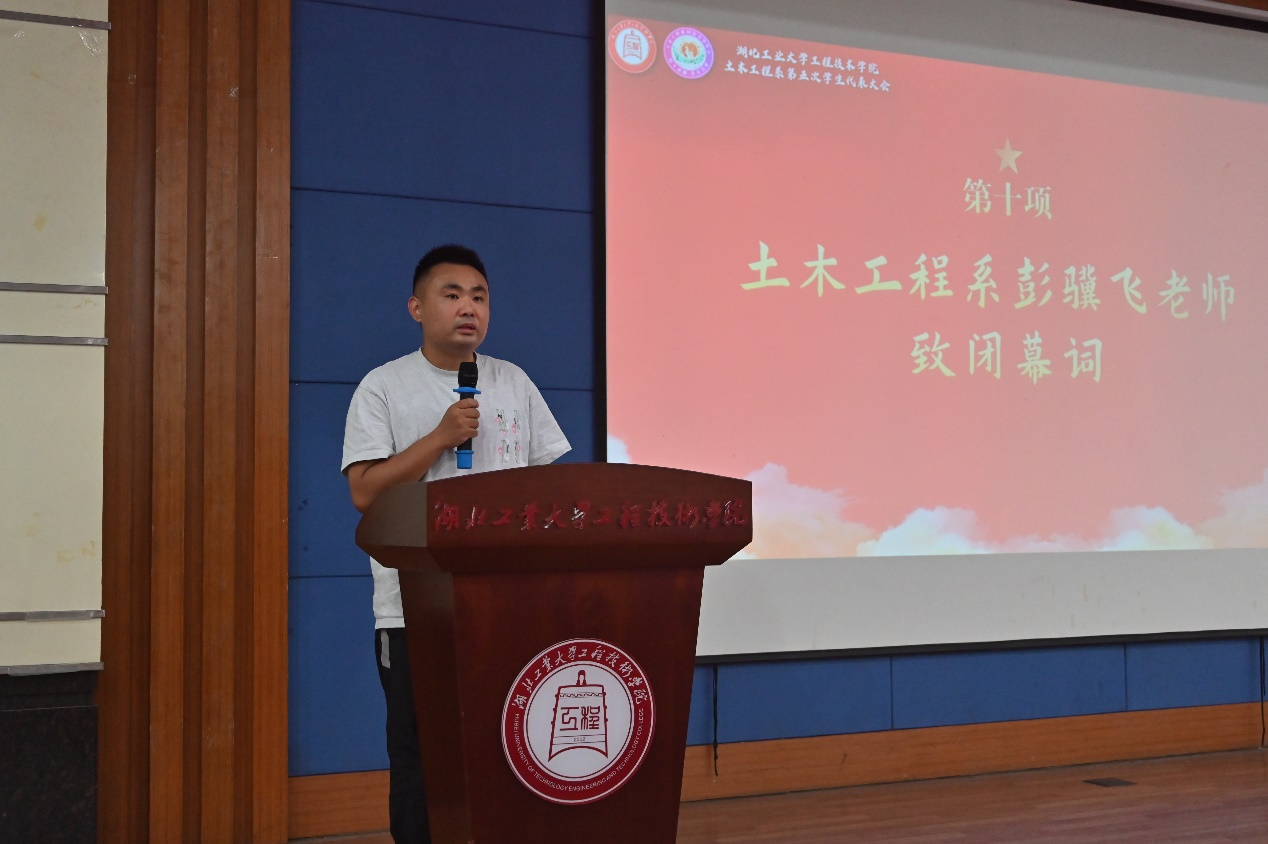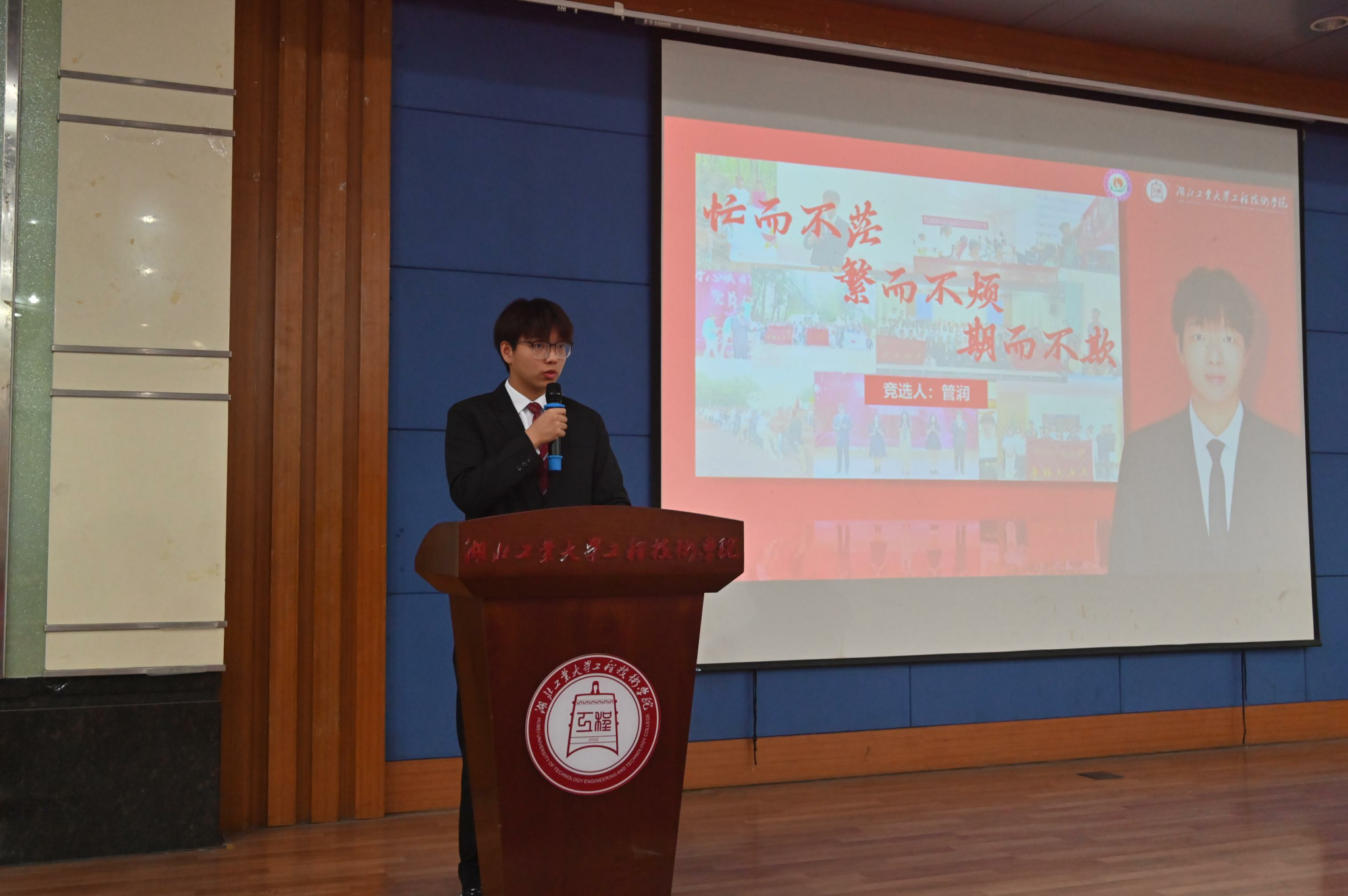 会议最后,彭骥飞老师发表总结致辞。首先,彭老师对即将上任的学生会主席团成员表示祝贺。他提出,学生干部首先要适应身份的转变,要有良好的心态。其次,他强调学生干部要有责任与担当意识,更要有集体荣誉感,把个人的发展与集体的发展相结合。最后,彭老师表达了对同学们的期望,他希望每个同学未来在自己的领域都能熠熠生辉,共同憧憬更美好的未来。