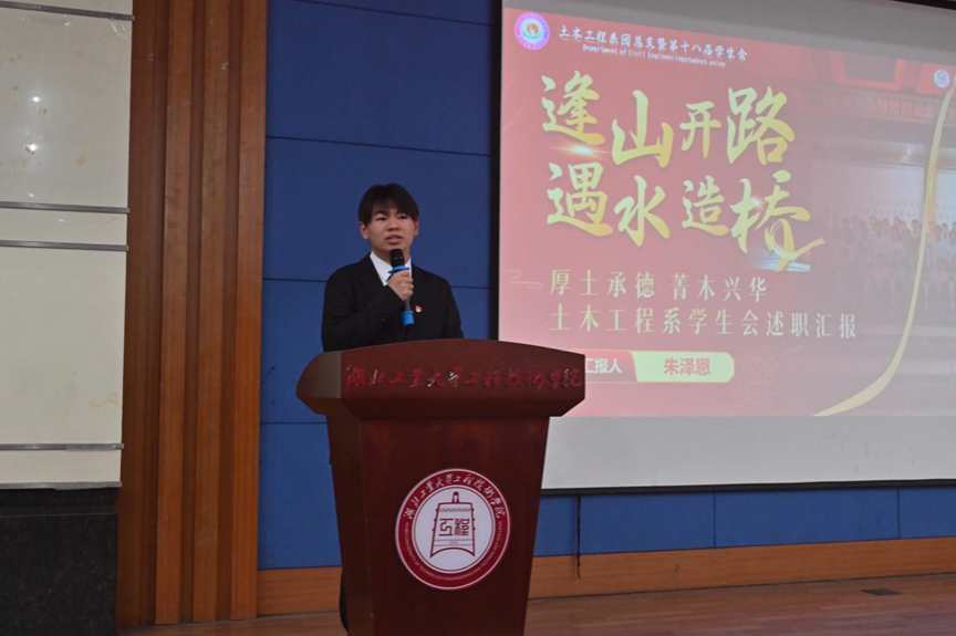 随后,院学生会主席彭宇致辞,他向我系第五次学生代表大会的召开表示祝贺。同时与参会代表交流了三点想法:一是聚焦主责主业,引领学生成长;二是强化服务意识,坚持学生为本;三是严管组织骨干,深化改革攻坚,坚定不移跟党走,奋进新时代,在强国建设、民族复兴的新征程中书写壮丽青春篇章。大会第三项,朱泽恩作为第十八届土木工程系学生会主席对去年一年的工作予以总结汇报。