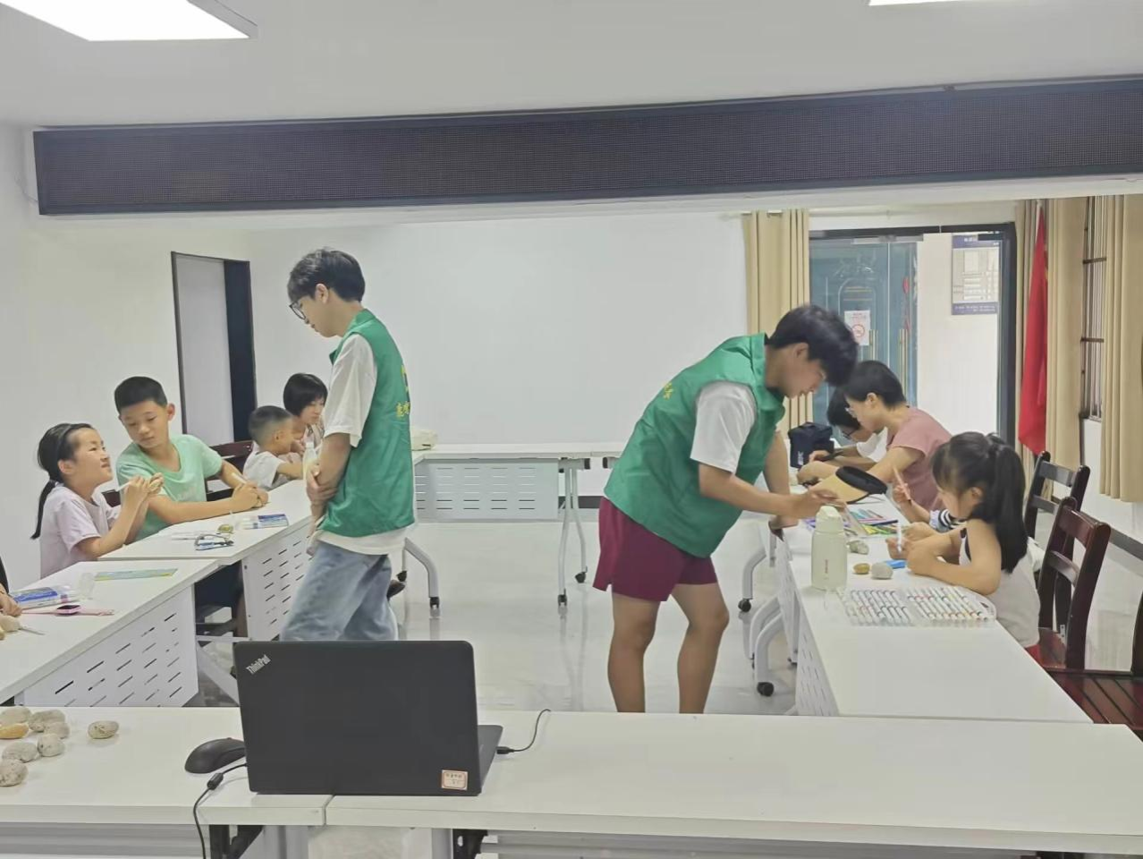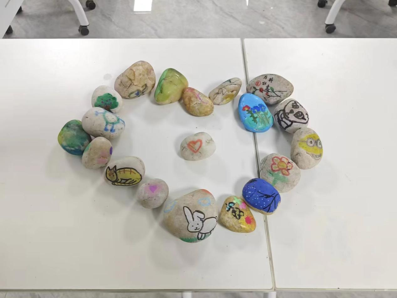 理论课后,志愿者们带领孩子们进行石头画创作活动。孩子们在志愿者的指导下,挑选自己喜欢的石头,并运用颜料和画笔,在石头上绘制出各种美丽的图案和色彩。