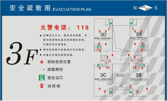 读者务必熟知所在楼层、所在库室、所在区域的安全逃生出口线路。