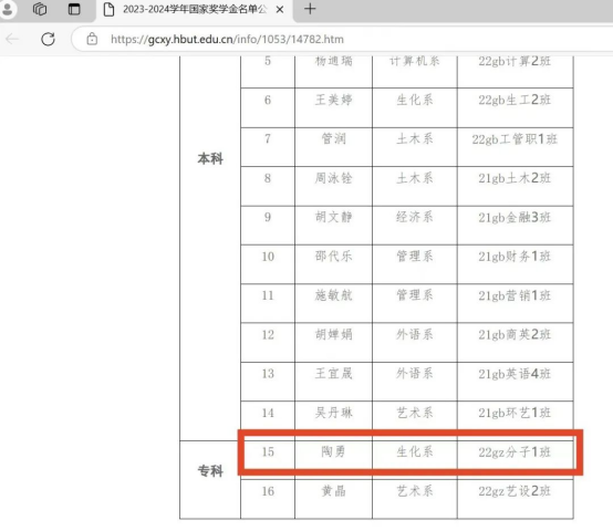 陶勇,男,生化工程系22gz分子1班学生。2022.9起,担任文体委员,培养组织能力;2022.9-2023.9 系团总支宣传部干事,积极投身;2023.9-2024.7 担任团总支宣传部部长。在做好组织者、履行者、担当者的道路上砥砺前行、始终如一,以突出的能力斩获多项荣誉奖项,展现出全面的素质与担当。