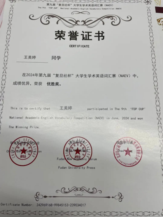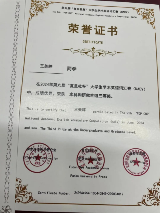 2024.6“复旦社杯”大学生学术英语词汇赛本科研究生组三等奖、优胜奖