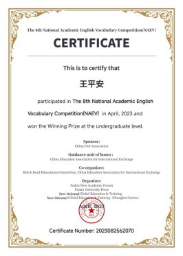 2023.6 获得第8届大学生学术英语词汇大赛优胜奖
