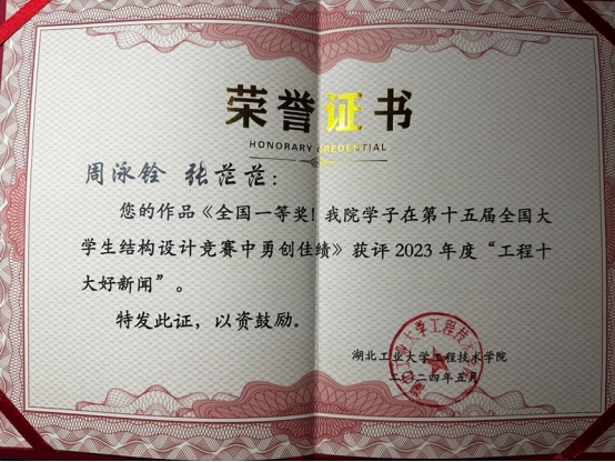 6、湖北工业工业大学工程技术学院2023-2024第五届结构设计竞赛一等奖(单人获奖)