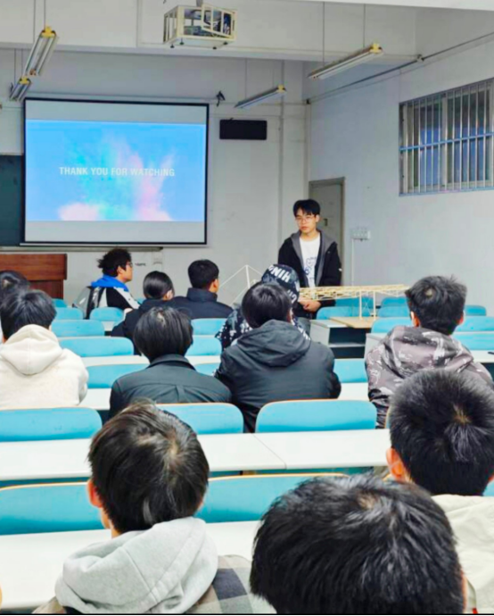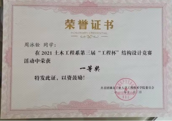竞赛之场,是勇气与智慧的较量;挑战之路,是成长与进步的阶梯!学习之余周泳铨同学积极投身于专业学科竞赛,探索未知、挑战自我。作为负责人,他在土木行业最具影响力的专业学科竞赛:全国大学生结构设计竞赛中,获得了国家级一等奖两项,省级一等奖两项,院级一等奖六项。在指导老师的引领下,周泳铨同学勇挑重担,作为团队核心力量连续三年带领团队斩获国赛资格,连续两年荣获国一。去年7月在第十届湖北省大学生结构设计竞赛中,作为唯一受邀的学生,他为全省400余名参赛师生分享学习历程和竞赛经验。那一刻周泳铨同学深感自豪、也更坚定了继续前行的决心!