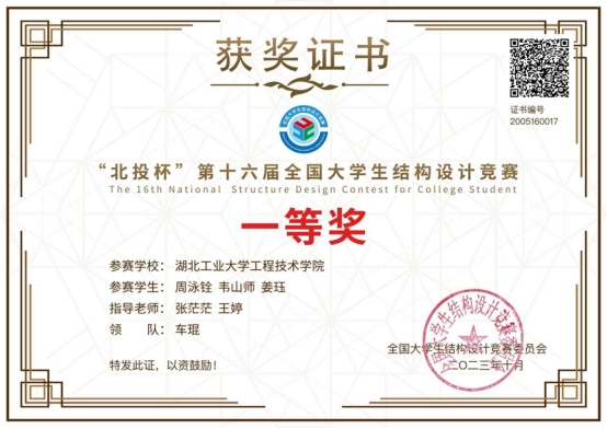 1、2023年“北投杯”第十六届全国大学生结构设计竞一等奖(团队负责人)