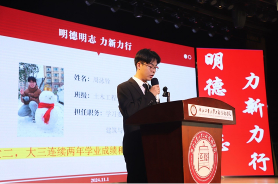 自大一开学以来,周泳铨同学就怀揣满腔热情,他秉持怀大志、立大德、成大才、担大任的理念,不断提升自己的思想品德和综合素养,努力做好新时代大学生。他也踊跃参与各类活动,在学院官网发表四篇新闻稿,于2023年获得优秀社团干部称号,2024年荣获工程十大好新闻作者称号。在这将近四年的宝贵时光里,他始终保持积极向上的心态,以高标准严格要求自己,努力协调好学习、工作、生活的关系,在班内担任学习委员的职务,在校内担任建筑与结构设计协会负责人,力求在德智体美劳等方面全面发展。