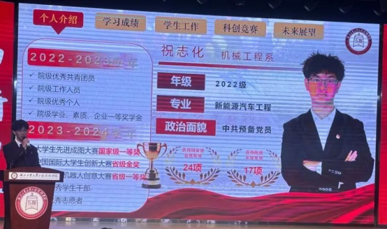 祝志化,男,中共预备党员,机械工程系22gb汽车2班学生。自2022年入学起,便积极投身于校园工作。2022.9 - 2023.9担任机械系团总支学生会文艺组干事,积累组织经验;2023.9起,身兼数职,先后担任学院宿舍管理委员会楼层长、青年创新发展中心团支部组织委员、亿航创客工作室负责人、青年创新发展中心主席,以及24gb汽车1班入党联系人。他在各岗位认真负责,组织各类活动,助力同学成长,以实际行动践行服务理念,展现出全面的能力与担当。