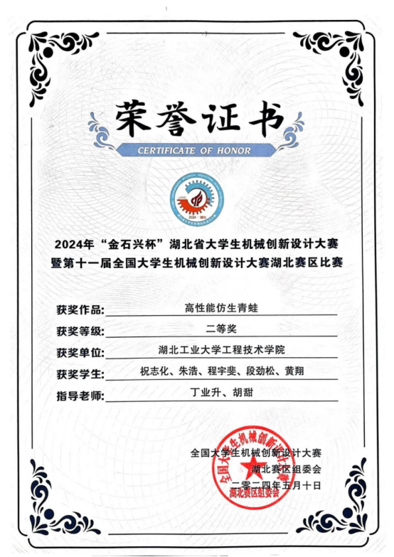 获得大学生机械创新设计大赛湖北赛区二等奖