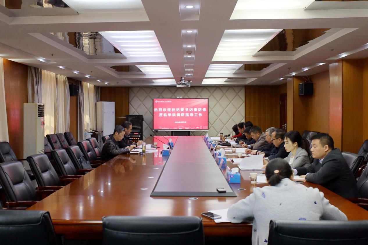 秦防修在听取学院工作的汇报后,肯定了学院在办学发展、党的建设、廉政建设及安全稳定等方面所取得的成绩,结合中央及省委相关会议精神,对学院工作提出了明确要求:一是压紧压实主体责任。持续深化改革创新举措,全力推进学院内涵式发展,积极探索契合现代教育理念的大学制度,构建具有鲜明工程特色的教育体系。同时要高标准做好2025年度政治生态分析研判工作,切实增强学院政治生态分析研判的系统性、全面性以及精准性。二是推进党纪学习教育常态化长效化。要巩固深化党纪学习教育成果,建立经常性和集中性相结合的纪律教育长效机制,融入组织管理全过程,推动形成完善制度、强化教育、从严执纪、养成自觉的完整链条。三是加强师德师风建设。从思想引领、激励机制、监督管理三个关键维度协同推进教师队伍建设。通过选树典型人物,发挥榜样的示范引领作用,引导广大教师严守为人师表的职业操守。有效运用监督执纪“第一种形态”,及时开展谈心谈话,加强日常监督管理。同时要积极响应全省专项整治工作部署,迅速将思想和行动统一到学校专项整治工作的具体安排上。四是落实群众点题监督工作。根据学校开展群众点题监督工作部署要求,立足学院实际,全面梳理群众身边的痛点、难点、堵点问题,高效完成点题收集阶段工作。
