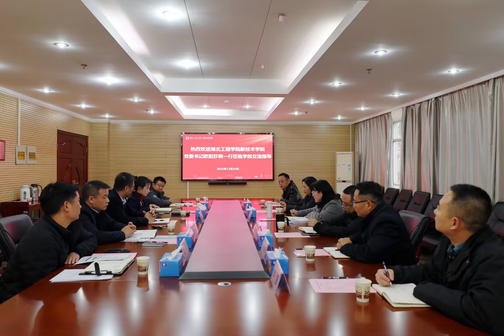 12月24日下午,湖北工程学院新技术学院党委书记欧阳莎莉一行莅临我院调研交流。座谈会在南教学区行政楼三楼会议室举行。学院党委书记朱爱军、副院长查纯出席会议,相关职能部门负责人参会。