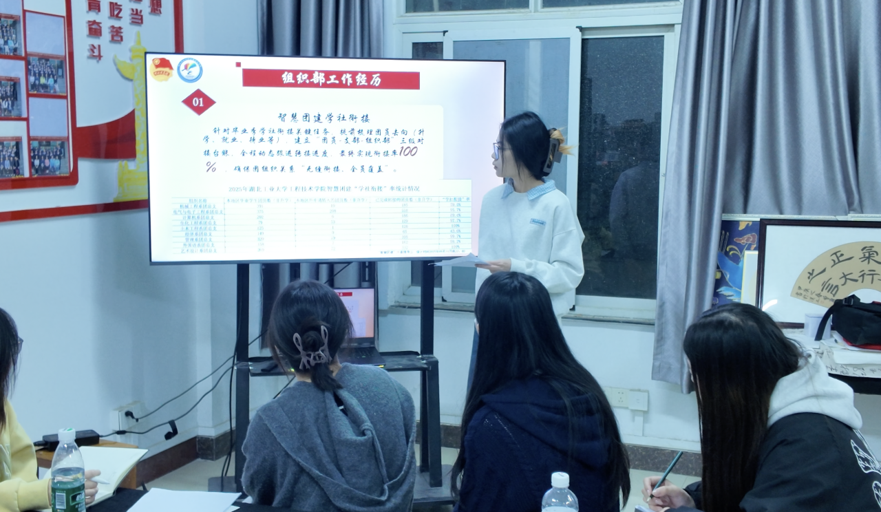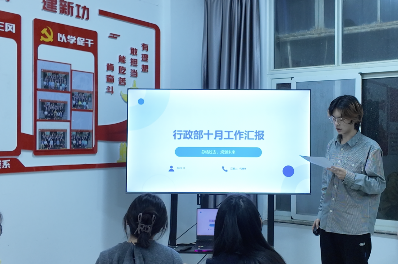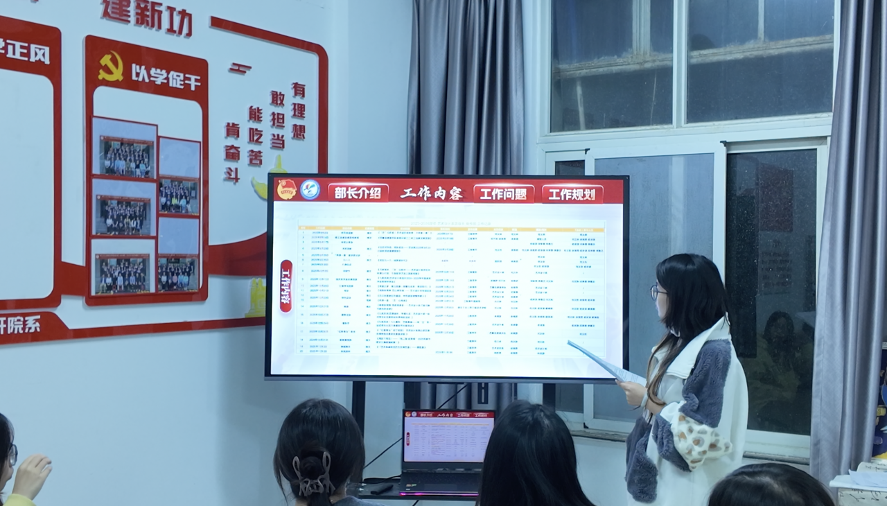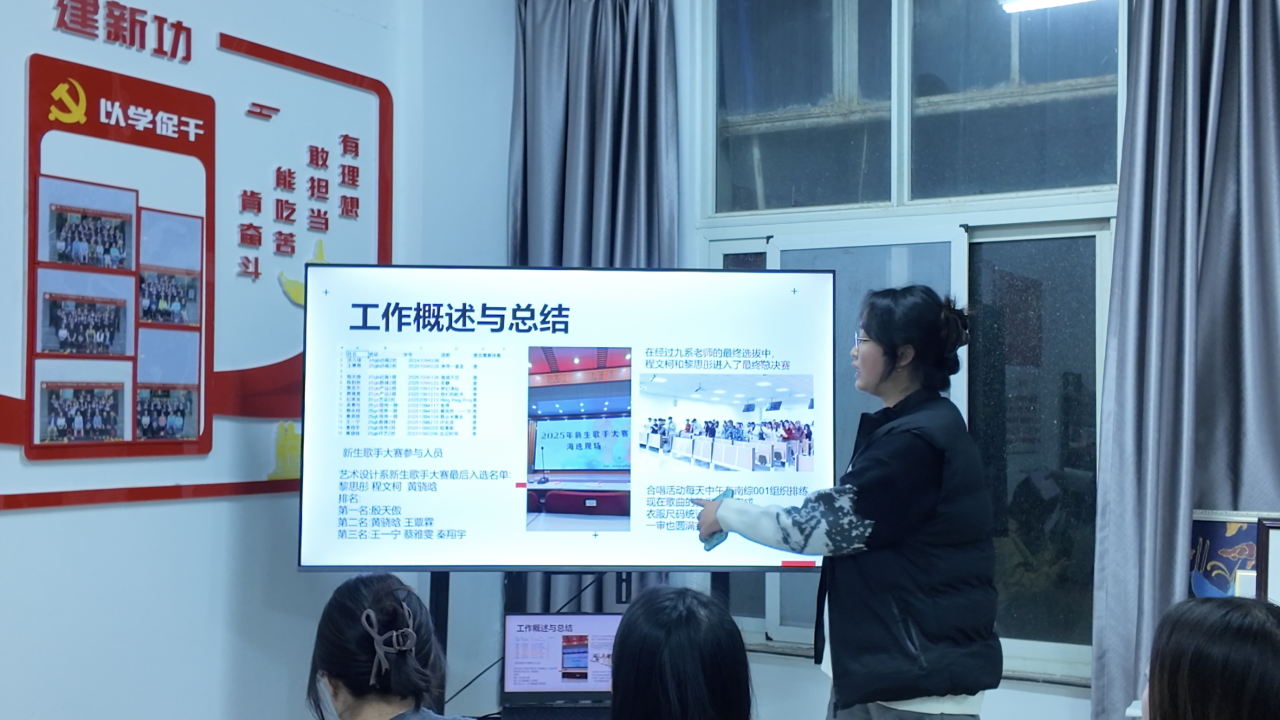 组织部就已完成的多项基础团务工作情况,提出加强队伍建设与部门联动,共建良好团学氛围。宣传部对过去两个月以来发布的推文与照片进行了总结,优化并确立了新的工作模式。作为艺术设计系对外的窗口,宣传部将继续致力于记录学生工作与活动,擦亮艺术设计系名片。文艺部与体育部介绍了多项文体活动的组织工作,学习部与行政部有序完成例会培训、课堂巡查、值班安排及信息统计等行政事务。未来将持续优化工作机制,开展技能培训,并协同各部门一起筹备“新老生交流会”等活动,提升部门的综合服务效能。科技部与生活权益部围绕同学生活需求与科技文化建设,开展了食堂价格、水电费透明度调研及学科竞赛培训等活动,积极回应了学生权益问题,积累了竞赛项目经验。未来,他们将持续守护同学权益,营造艺术设计系更加浓烈的学科竞赛氛围。艺馨志愿服务队重点介绍了志愿队成员刘雨轩同学获评“红巷青马”季度之星,任慧青同学在“中华魂”演讲比赛中获得青年组优秀奖。后续将推进省农科院宣讲、厨艺大赛等活动,优化工作、提升服务,践行志愿精神与青年担当。