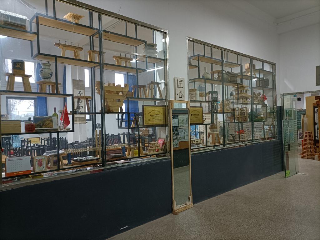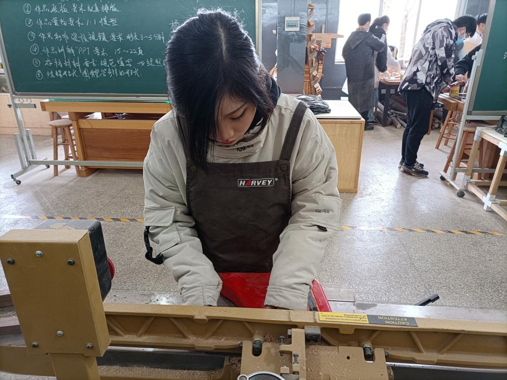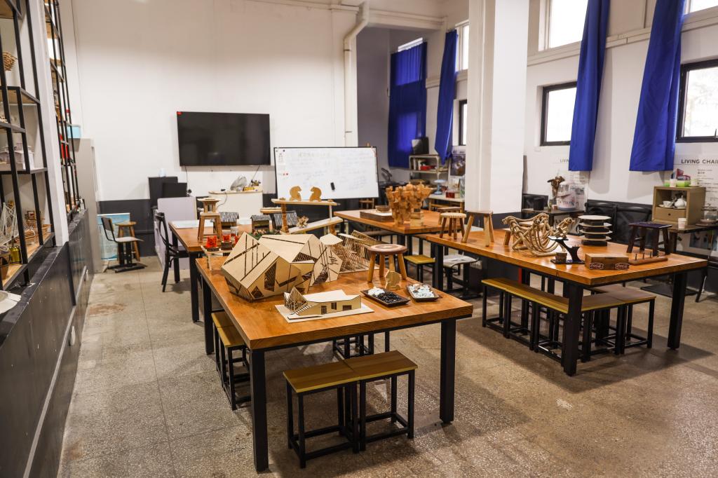 综合项目实验室的空间布局上,划分了四个主要分区:固定机具设置了加工区、手工操作和组装处理区、车旋独立实践区。320平方米的空间,可以同时满足4组(每组5~8人)的学习和独立实践。按批次实现轮训实践、课时实践需求。