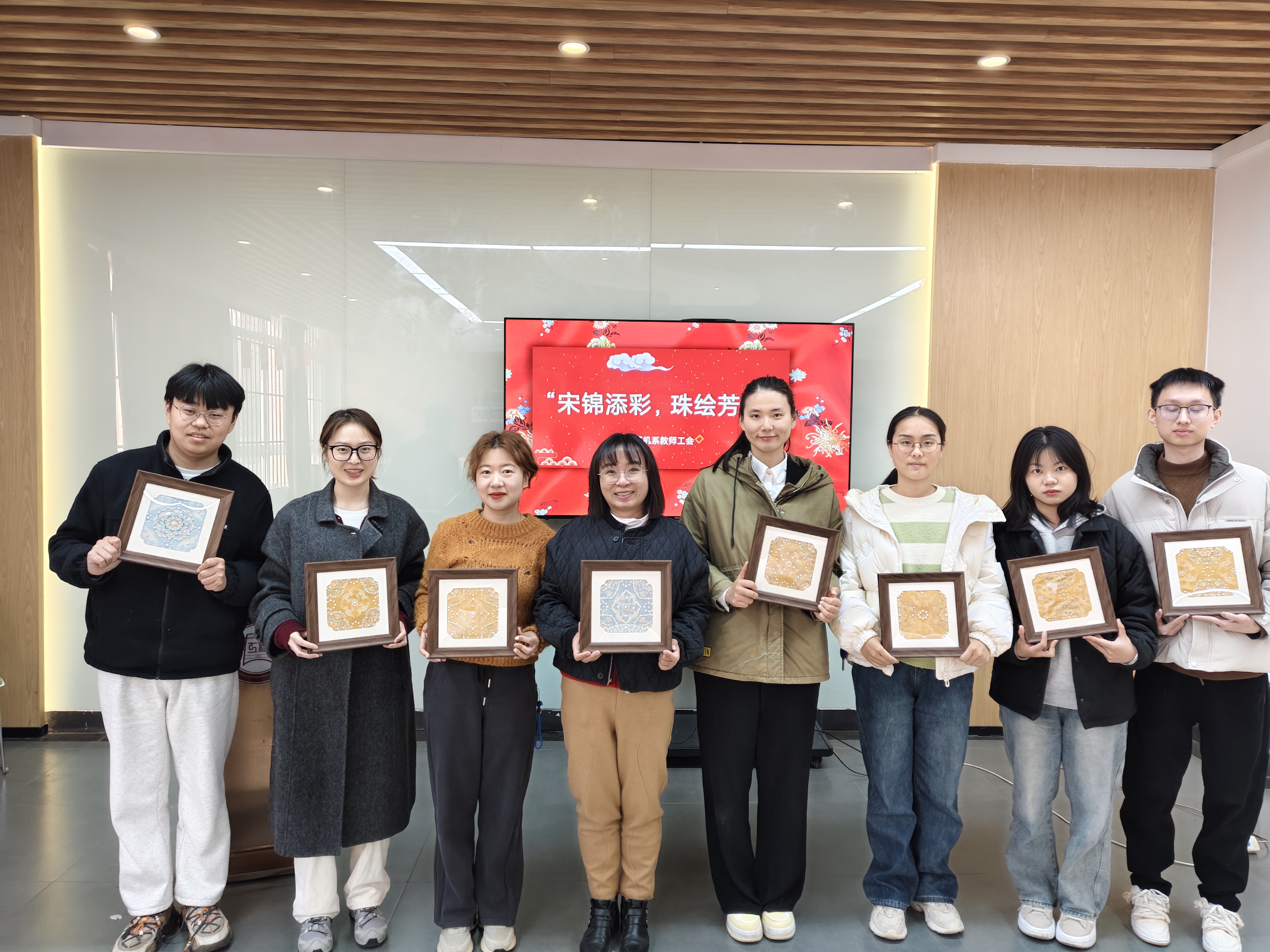 通过视频展示与实物讲解,教职工们深入了解了宋锦的文化历史,其独特的起源、发展历程以及在不同时期的特色。在实践环节中,老师们纷纷发挥创意,将珍珠镶嵌于锦面之上,制作出一幅幅兼具传统韵味与现代美感的手工作品。大家在制作的过程中,不仅感受到了传统手工艺的魅力,对传统文化有了更深的认识,还增进了彼此间的交流互动。