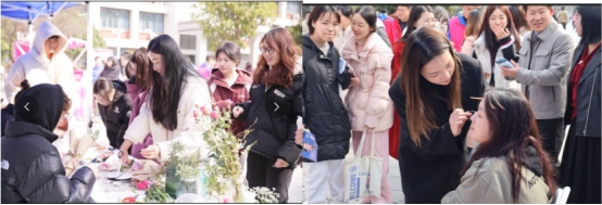 招聘会当天恰逢“三八”国际劳动妇女节,学院招就中心特别在现场设置了“职场妆容体验日”展位,邀请专业化妆师现场为女大学生讲解并示范职业妆容知识。从基础护肤到彩妆步骤,化妆师们耐心指导,帮助女生们掌握打造得体职业形象的技巧,让她们在求职面试中更加自信从容。学院招就中心还与艺术设计系联动,设置了非遗文化展位,展出掐丝珐琅画、插花等非遗作品。这些精美的展品不仅吸引了众多学生驻足欣赏,更让学生们在感受传统文化魅力的同时,拓宽了对文化创意产业相关职业的认知视野,为就业选择提供了新的思路。这两个特色展位受到了学生们的热烈欢迎,成为招聘会现场的热门打卡点。