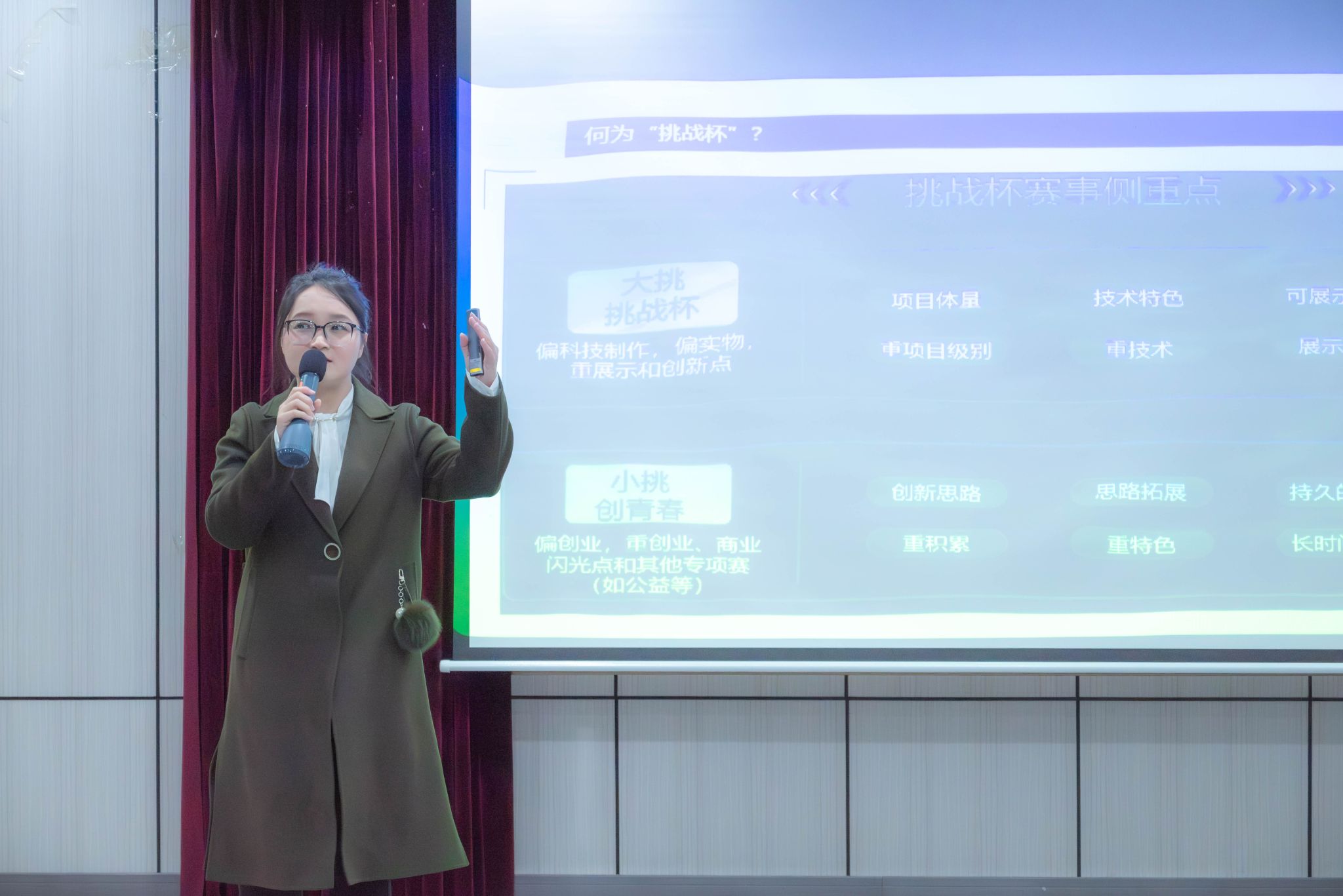 在学生分享环节,学院优秀毕业生、湖北工业大学在读研究生徐炜洲以及护果先锋项目代表人王姝璎同学分享了他们在“挑战杯”中的参赛经历、团队优势、技术特色和心得体会。他们的故事激励着在场的每一位同学,让大家更加坚定了在科技创新道路上不断前行的信心。