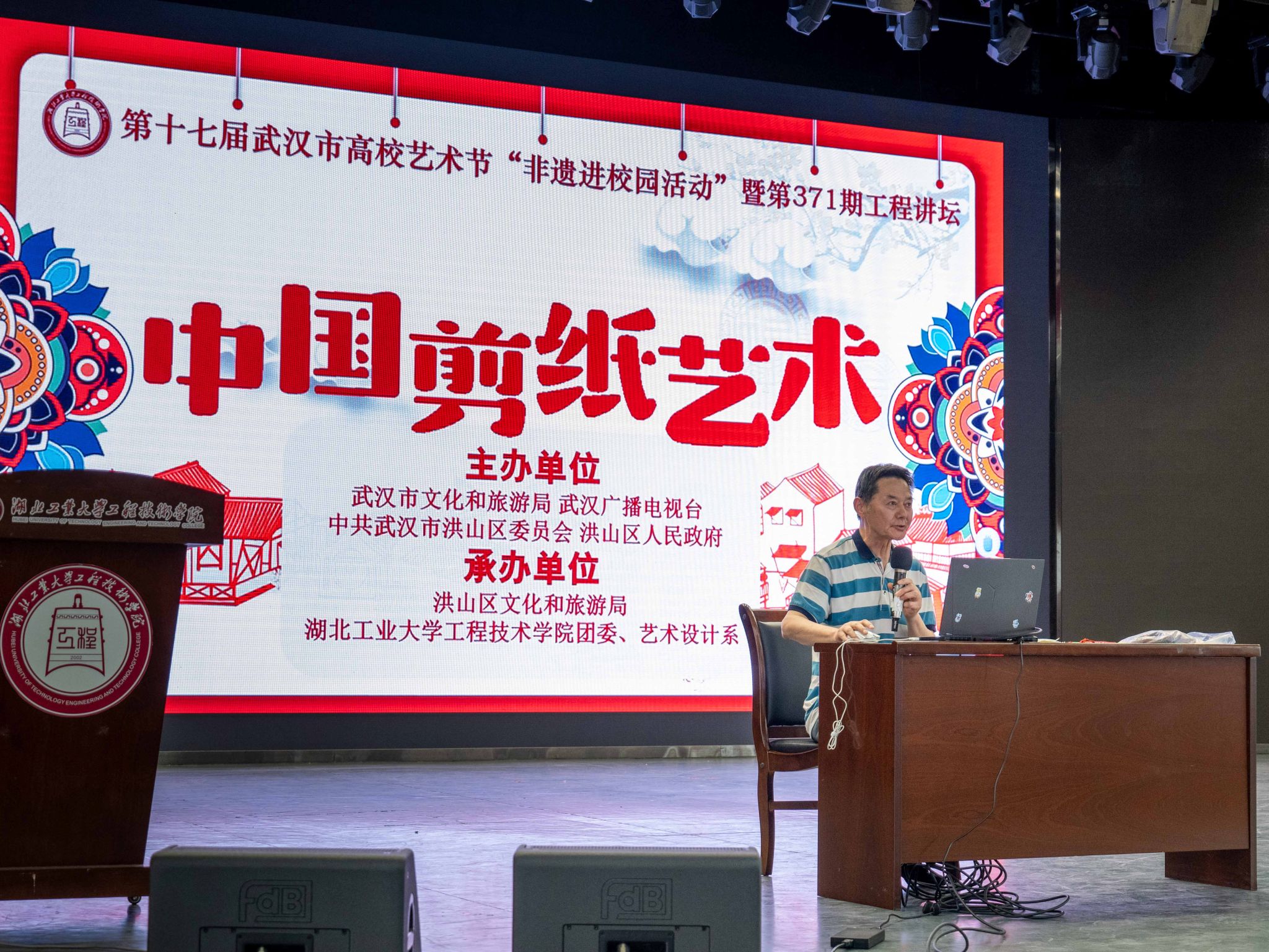 5月17日下午,由学院团委与武汉市文化和旅游局、武汉广播电视台、武汉市非物质文化遗产保护中心联合开展的“非遗进校园活动”之中国剪纸艺术讲座,在学院博雅园三楼报告厅举行。洪山区非物质文化遗产保护中心主任陈清、湖北圣天文化传媒有限公司总经理齐子磊出席活动。