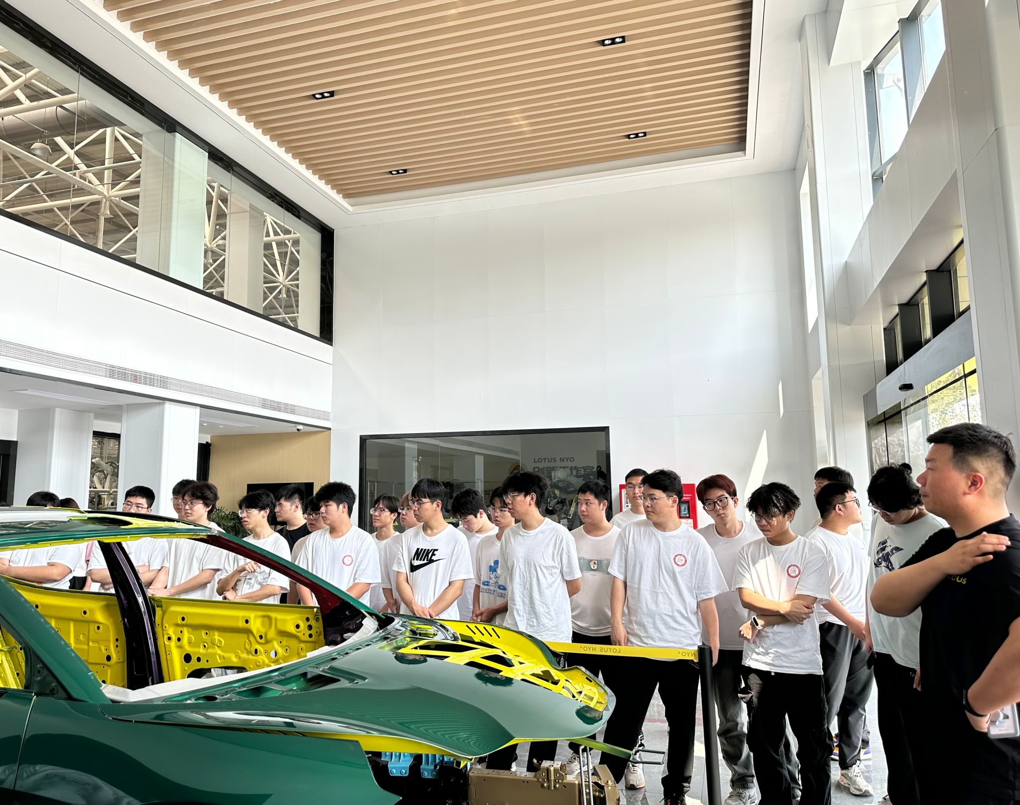 在工厂工作人员的带领下,学生们实地参观了路特斯全球智能工厂的数字化孪生车间,了解到了路特斯的发展历程、工厂布局及环境、工厂运作,对路特斯的系列产品和企业内部的工作流程有了更加直观的认识。