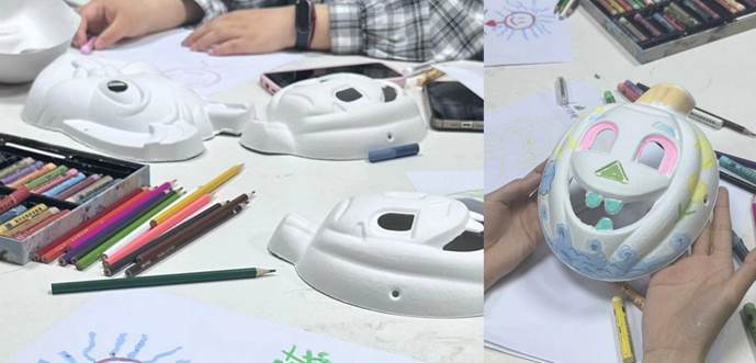 活动中,同学们用不用颜色的彩笔,自由绘画自画像,介绍画像中的自己,再通过互画像,了解别人眼中的自己。自画像环节中,刘同学说:“选择用棕色蜡笔画自己,觉得自己的肤色太黑,很自卑”,随后在互画环节中,王同学为刘同学画自画像改用了黄色蜡笔并鼓励到:“你的肤色很健康,而且你头发卷卷的,很可爱。”最后每位同学选取一个面具,绘制出自己理想中的形象。同学们在面具上用自己喜欢的颜色画了小狗、小鸟、太阳、花草、云朵、海洋、笑脸等等,并谈到了对未来生活的美好憧憬。团辅过程中,陈老师引导同学们认识自己和他人眼中独特的美,鼓励同学们发掘内心的美好期望,正视自身的优缺点,接纳自己的容貌,不被焦虑情绪所束缚。