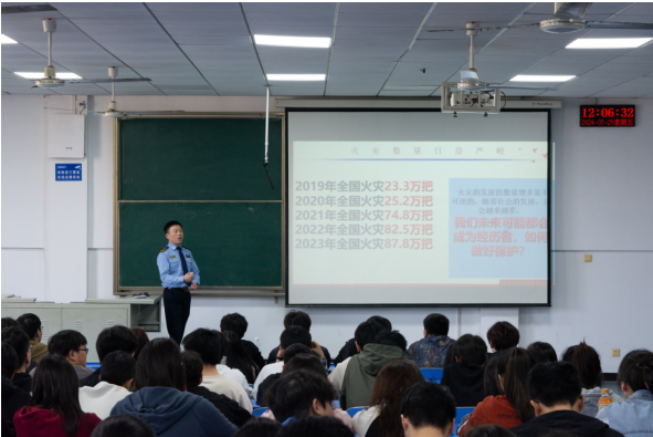 本次培训特别邀请到武汉市进安防火中心高级消防教官汪洋进行讲解,汪洋以故事分析、图文视频等方式,播放讲解了近年来各地发生的多起重大火灾及安全事故案例,触目惊心的画面和数字极大地震撼了在座师生,让师生深切感受到火灾的无情以及掌握消防知识的重要性。